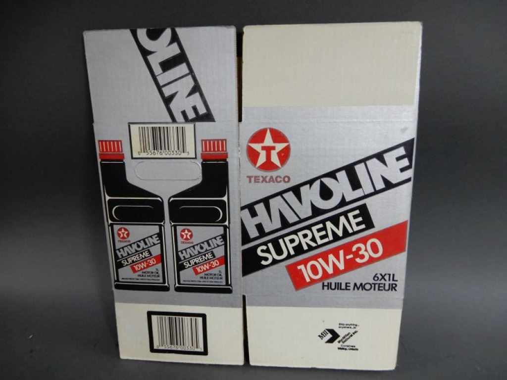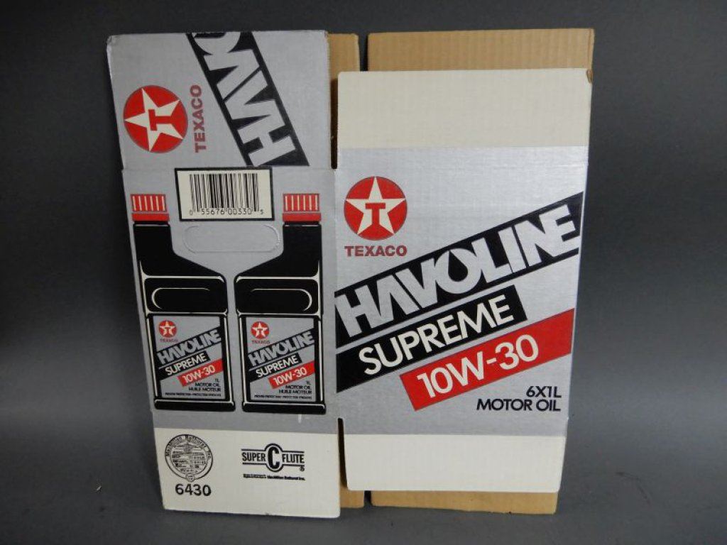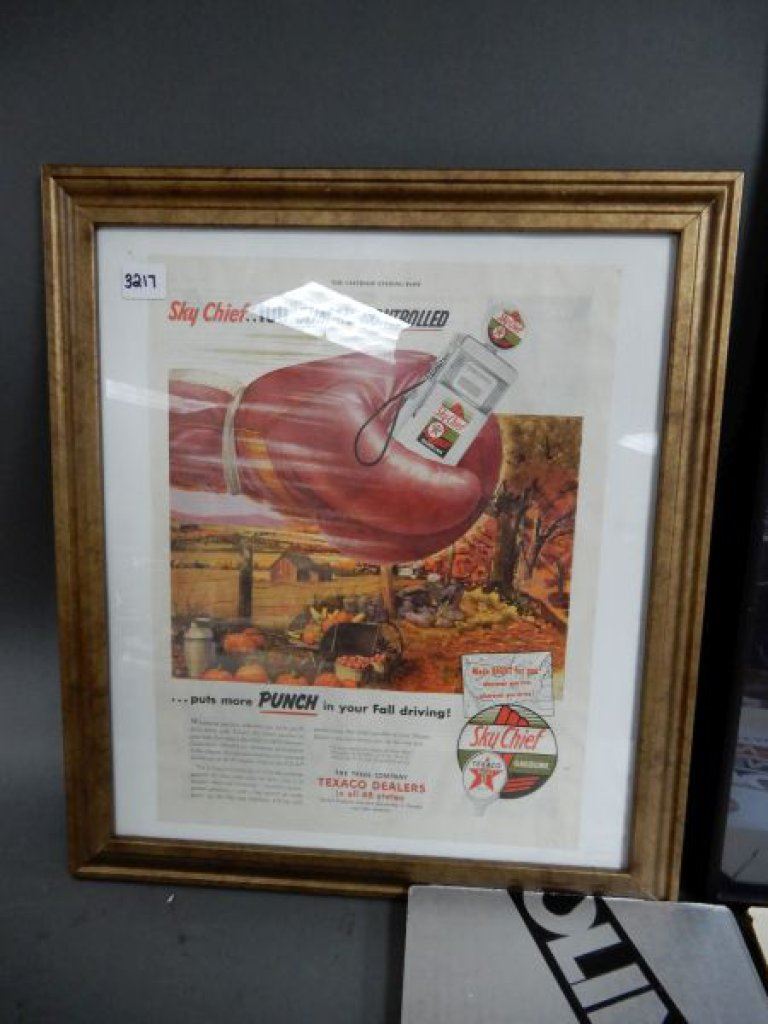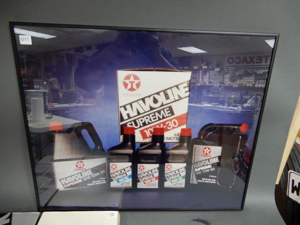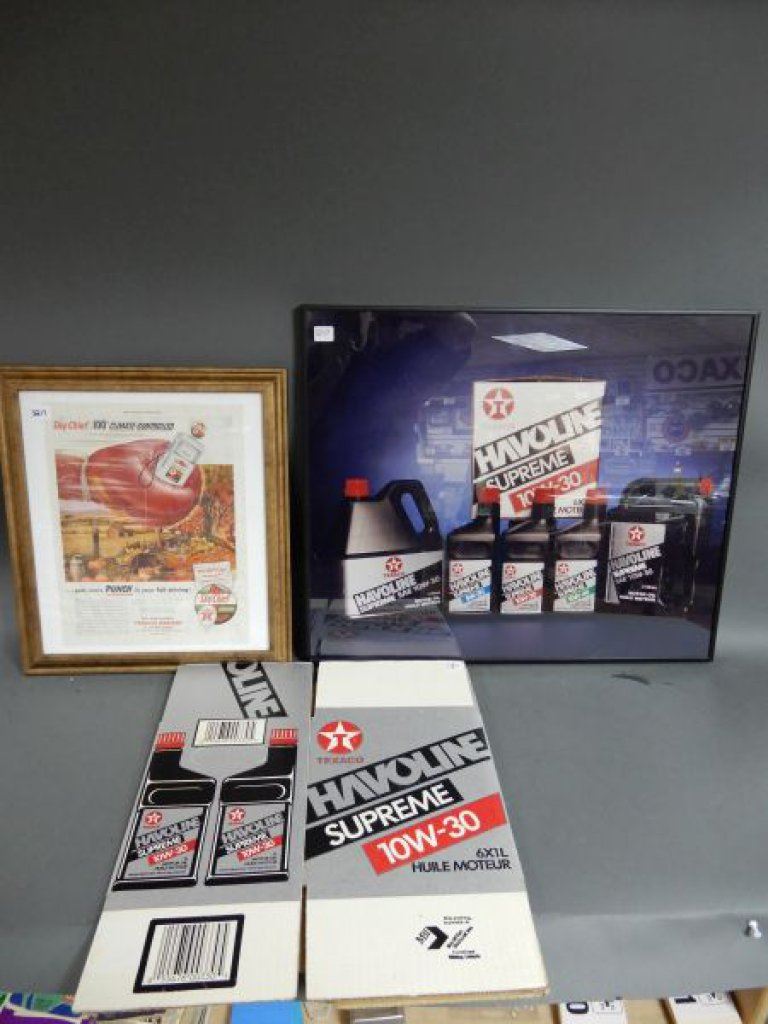 LOT OF 3 TEXACO ADVERTISMENTS THE SATURDAY EVENING POST FRAMED TEXACO SKY CHIEF - 17 1/4" X 15 1/4" - HAVOLINE SUPREME 10W30 FRAMED ADVERT 24 1/4" X 20 1/4" - PROTO-TYPE 6 PACK CARDBOARD CASE LOCATION: LOWER RIGHT