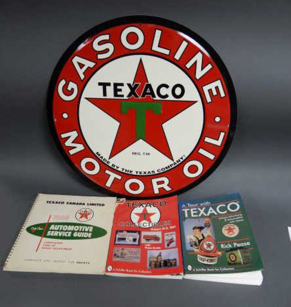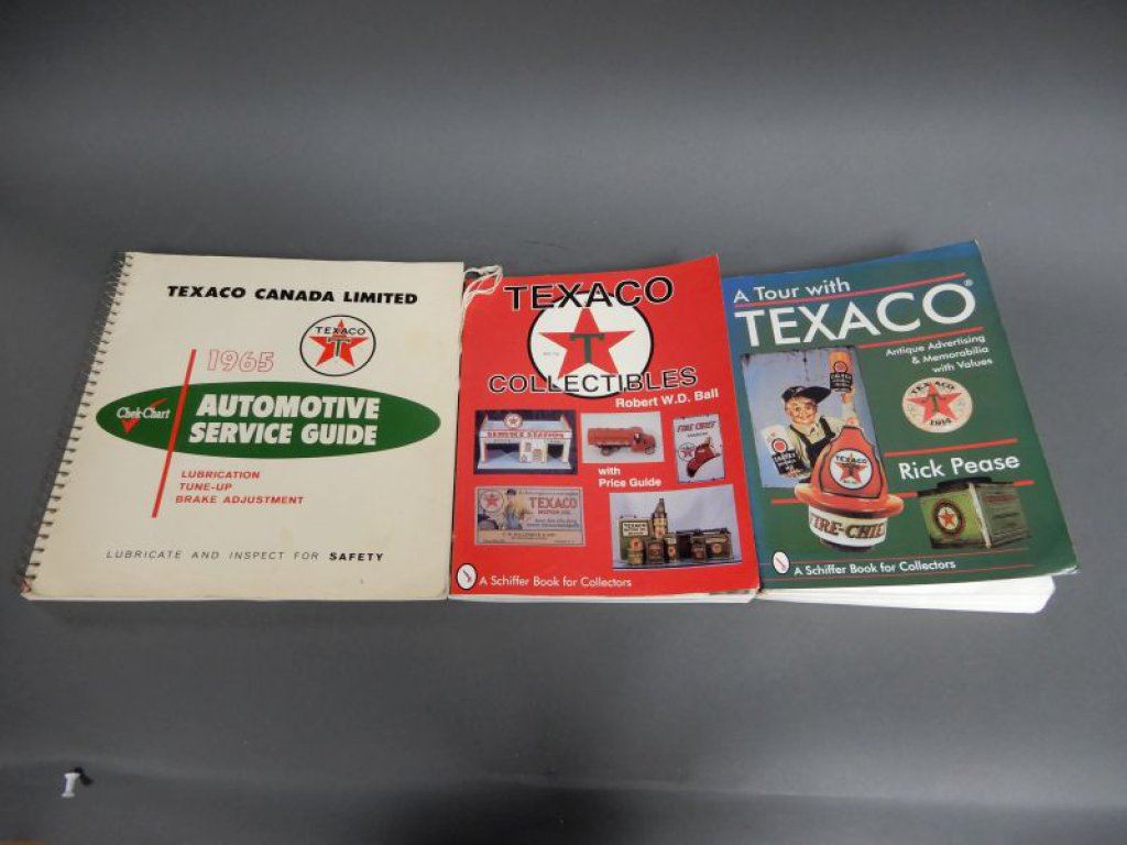 LOT OF 3 TEXACO BOOKS & 24" SST EMBOSSED REPRO SIGN BOOKS - 1965 AUTOMOTIVE SERVICE GUIDE - TEXACO COLLECTIBLES - A TOUR OF TEXACO LOCATION: LOWER RIGHT