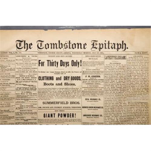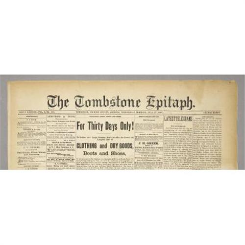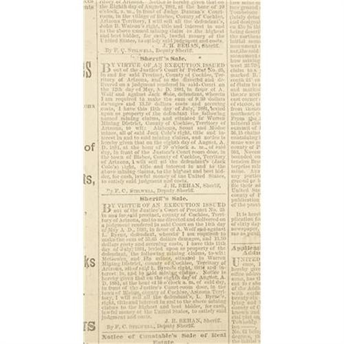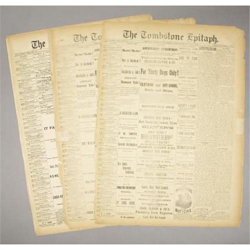 <B>LOT OF (3) “THE TOMBSTONE EPITAPH” ARIZONA NEWSPAPERS 1881</B></I> - Tombstone, Cochise County Arizona. This lot consists of 3 different newspapers pertaining to the famous Tombstone Arizona Territory. They all mention J. H. Behan, Sheriff & F. C. Stilwell Deputy Sheriff on Sheriffs sale. News of the day, ads, Etc. Poor-good condition.<BR><BR><b>Shipping:</b> Flat Material, Large (<a target="_blank" href="http://www.heritageauctions.com/common/shipping.php">view shipping information</a>)