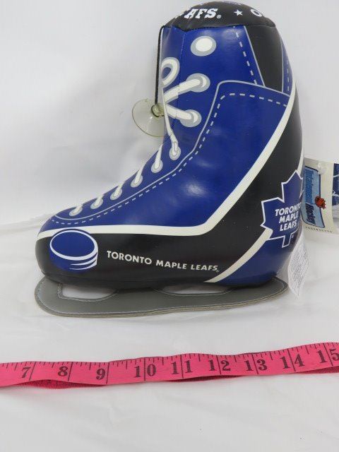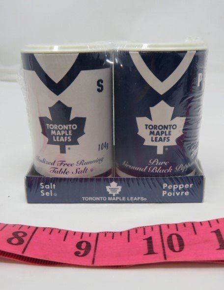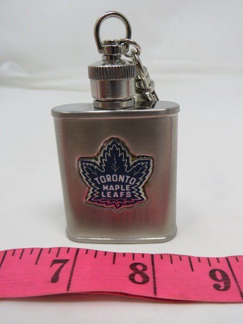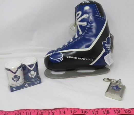 LOT OF 3 TORONTO MAPLE LEAF ITEMS (STUFFED SKATE, SALT AND PEPPER SHAKERS AND KEY CHAIN FLASK)