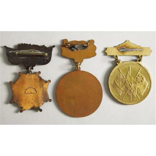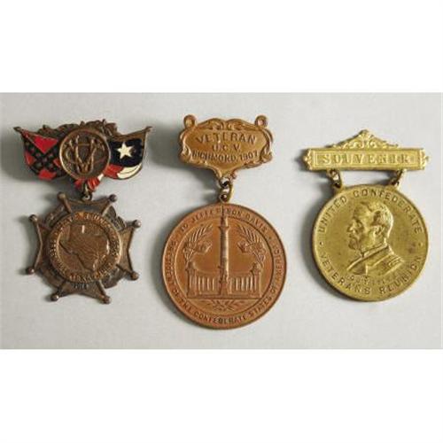 <B>LOT OF THREE UCV (UNITED CONFEDERATE VETERANS) SUSPENSION BADGES.</B></I> - <B>First.</B></I> Top of pin back bar, <I>souvenir</B></I>, underneath pin back, a round plaque with <I>United Confederate Veterans Reunion</B></I> with impression of Robert E. Lee. Verso, image of 3 Confederate flags. <B>Second.</B></I> Top of pin back bar, <I>UCV with 2 painted Confederate flag, </B></I>the plaque under suspension pin, <I>State reunion Greenville, Texas, July 30-31, </B></I>with map of Texas in middle and date <I>1914.</B></I> <B>Third.</B></I> Pin back suspension bar, <I>Veteran, U.C.V</B></I>. <I>Richmond, 1907</B></I>. Under suspension bar, Davis Monument 1861-1865 <I>to</B></I> <I>Jefferson Davis, President of Confederate States of America</B></I>. <I> </B></I><BR><B><BR>Provenance: </B></I>CSA Surgeon Samuel Caldwell, Forrest's Cavalry<B><BR><BR>Condition:</B></I> Very fine <BR><BR><b>Shipping:</b> Miscellaneous Collectibles, Smal (<a target="_blank" href="http://www.heritageauctions.com/common/shipping.php">view shipping information</a>)