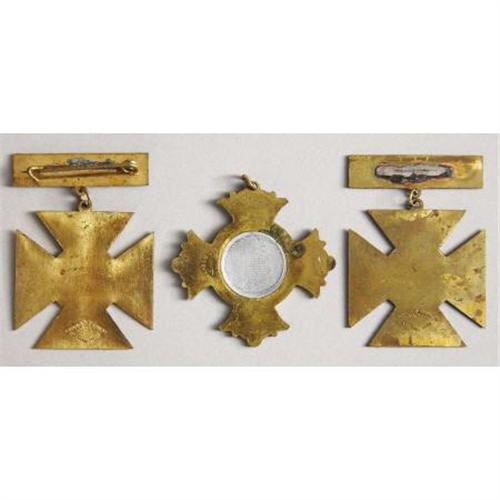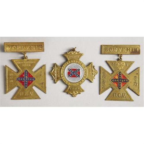 <B>LOT OF (3) UCV (UNITED CONFEDERATE VETERANS) SUSPENSION BADGES.</B></I> - <B>First.</B></I> Top pin back bar missing, Maltese cross <I>souvenir</B></I>, at top left, <I>May</B></I>, right, <I>19-22</B></I>, bottom, <I>1904</B></I>. In middle outside edge <I>United Confederate Veterans</B></I> with aluminum center and Confederate painted flag. <B>Second.</B></I> Top of pin back bar, <I>Souvenir, </B></I>the plaque under suspension bar, <I>Macon, Ga. May 7-9, 1912, UCV, </B></I>middle painted Confederate flag. <B>Third.</B></I> Top of pin back bar, <I>Souvenir, </B></I>the plaque under suspension bar, <I>Chattanooga, Tenn. May 26-29, 1913, UCV, </B></I>middle painted Confederate flag. <I> </B></I><BR><B><BR>Provenance: </B></I>CSA Surgeon Samuel Caldwell, Forrest's Cavalry<B><BR><BR>Condition:</B></I> Very fine <BR><BR><b>Shipping:</b> Miscellaneous Collectibles, Smal (<a target="_blank" href="http://www.heritageauctions.com/common/shipping.php">view shipping information</a>)