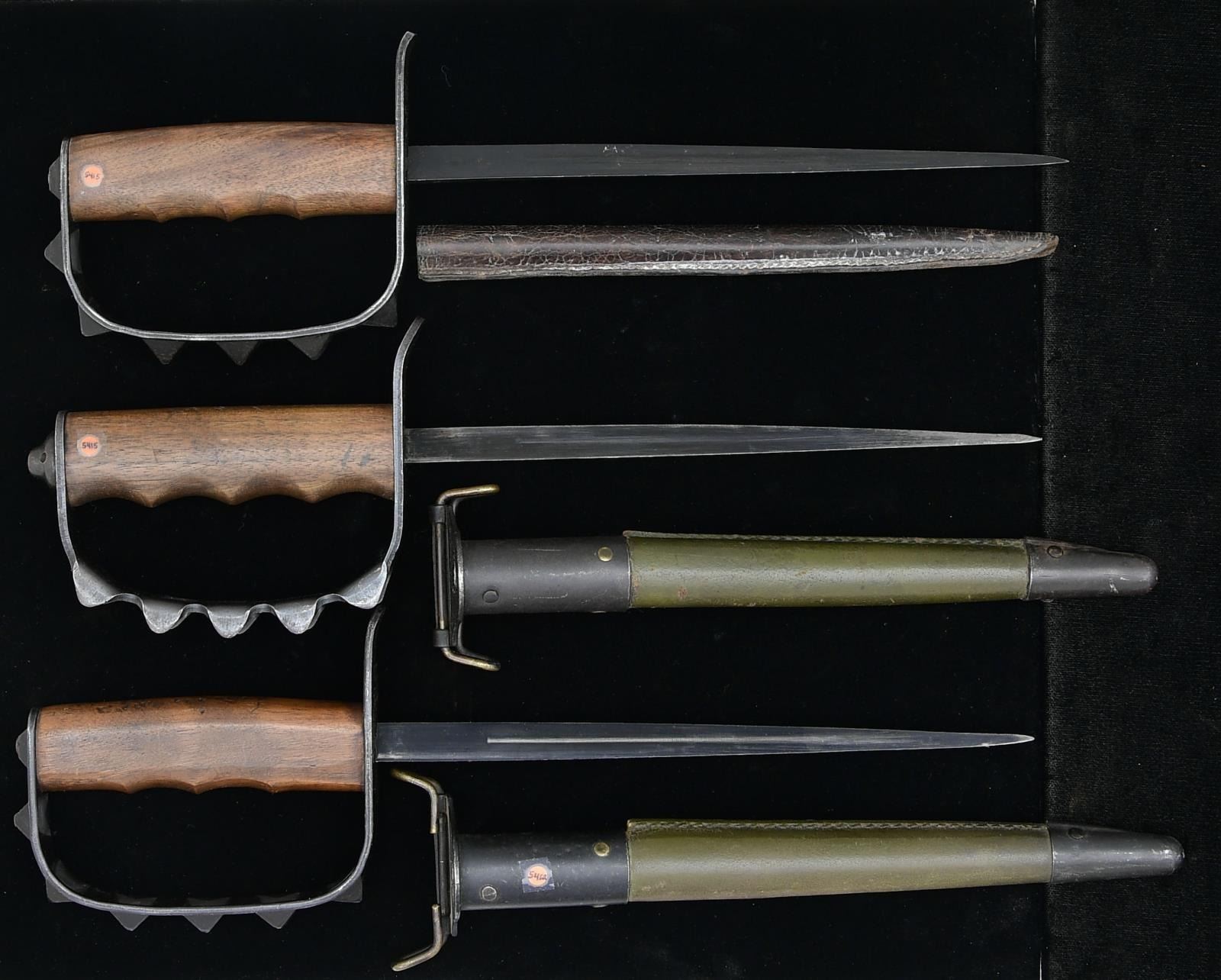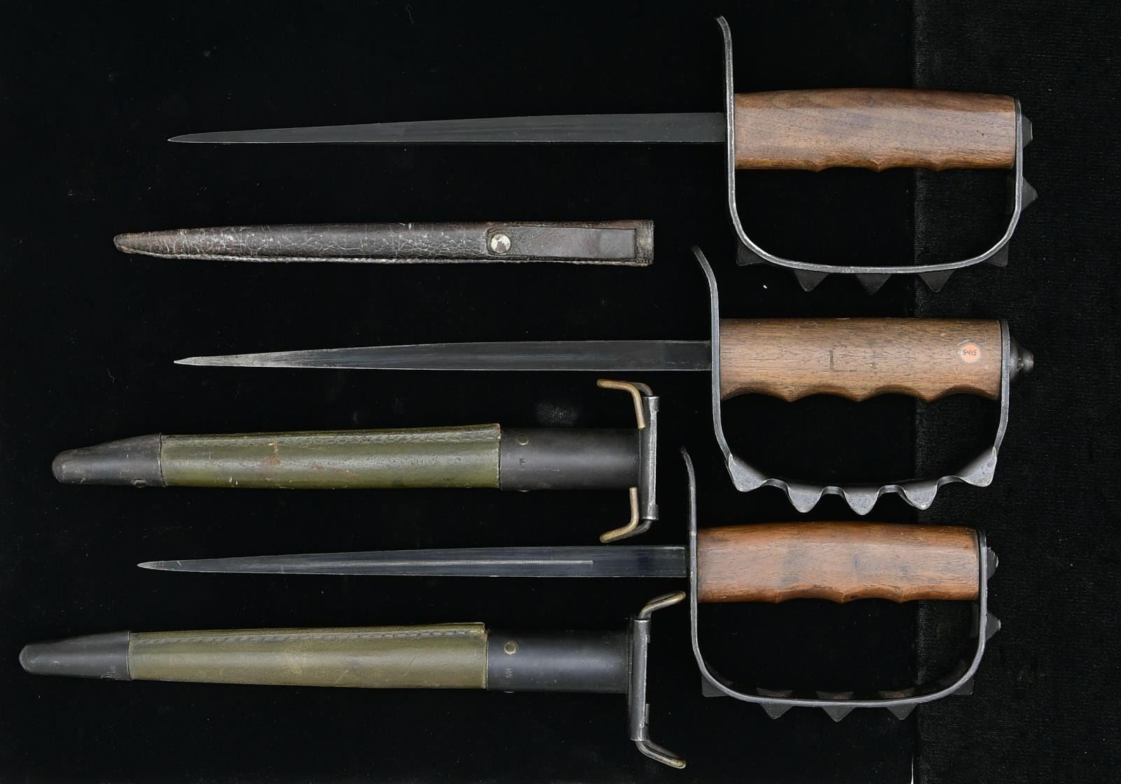 1. AMERICAN CUTLERY COMPANY M1917 TRENCH KNIFE. Overall length 14 1/4". Triangular blade length 9". Inside of guard marked "A.C. CO USA 1917". Wooden grip. Iron mounted green leather scabbard. CONDITION: grips show scattered dings & handling wear. Metal parts show some fading to gray, oxidation & edge wear. Scabbard is in good condition w/ some flaking & light oxidation. 2. L.F.&C M1917 TRENCH KNIFE. Overall length 14". Blade length 9 1/4". Crossguard marked "US/L.F&C/1917". Wooden grips. Iron mounted green leather scabbard. CONDITION: grips show scattered dings & handling wear. Metal retains much blue finish w/ some scattered fading & light oxidation. Scabbard shows some light flaking on leather & light oxidation on metal. 3. L.F.&C M1917 TRENCH KNIFE. Overall length 14". Blade 9 1/4". Crossguard marked "US/L.F&C/1917". Wooden grips. Plain leather scabbard. CONDITION: grips show some dings & handling wear. Metal retains much of its black parkerized finish w/ some edge wear & light oxidation. Scabbard shows overall crazing & dust staining. PROVENANCE: From the Lifelong Collection of Glen E. Mattox. (02-18719/MJC). $600-1000.
