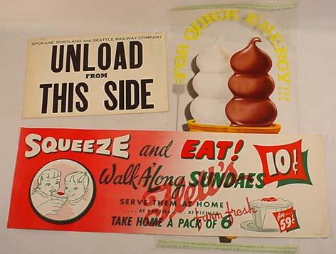 LOT OF 3 VINTAGE ADVERTISING SIGNS - Nabisco Ice Cream, Squeeze and Eat Walk Along Sundae and Spokane, Portland and Seattle Railway Sign.