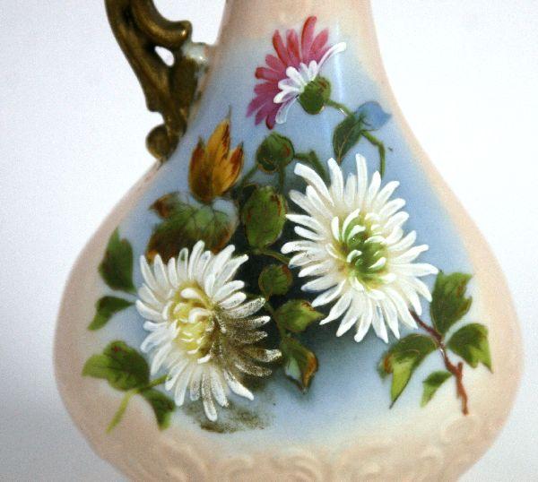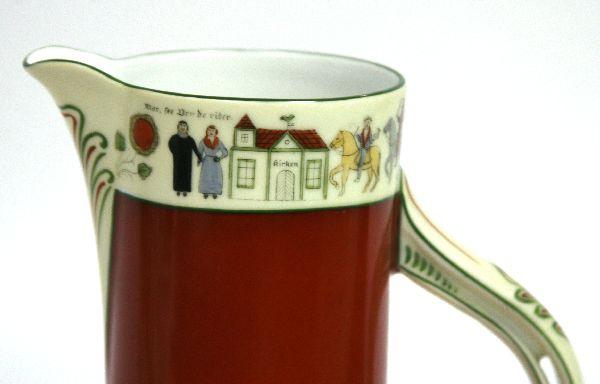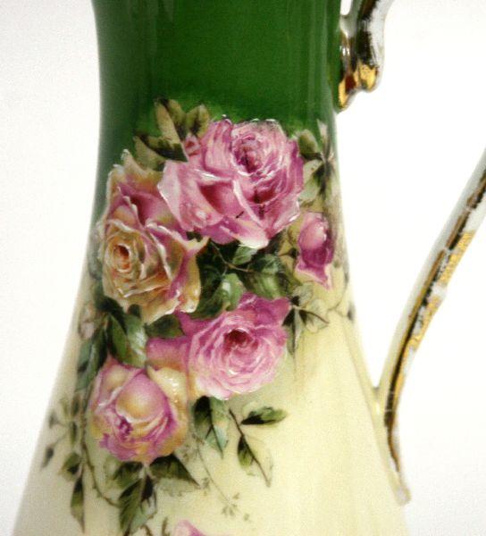 Included is a 10.5 inch Austrian hand painted pitcher from Victoria Carlsbad, a 10.5 inch Royal Bavarian pitcher with hand painted roses and green and gold trim and a Norwegian "Wedding Procession" pattern pitcher in red (also 10.5 inches tall). All are i