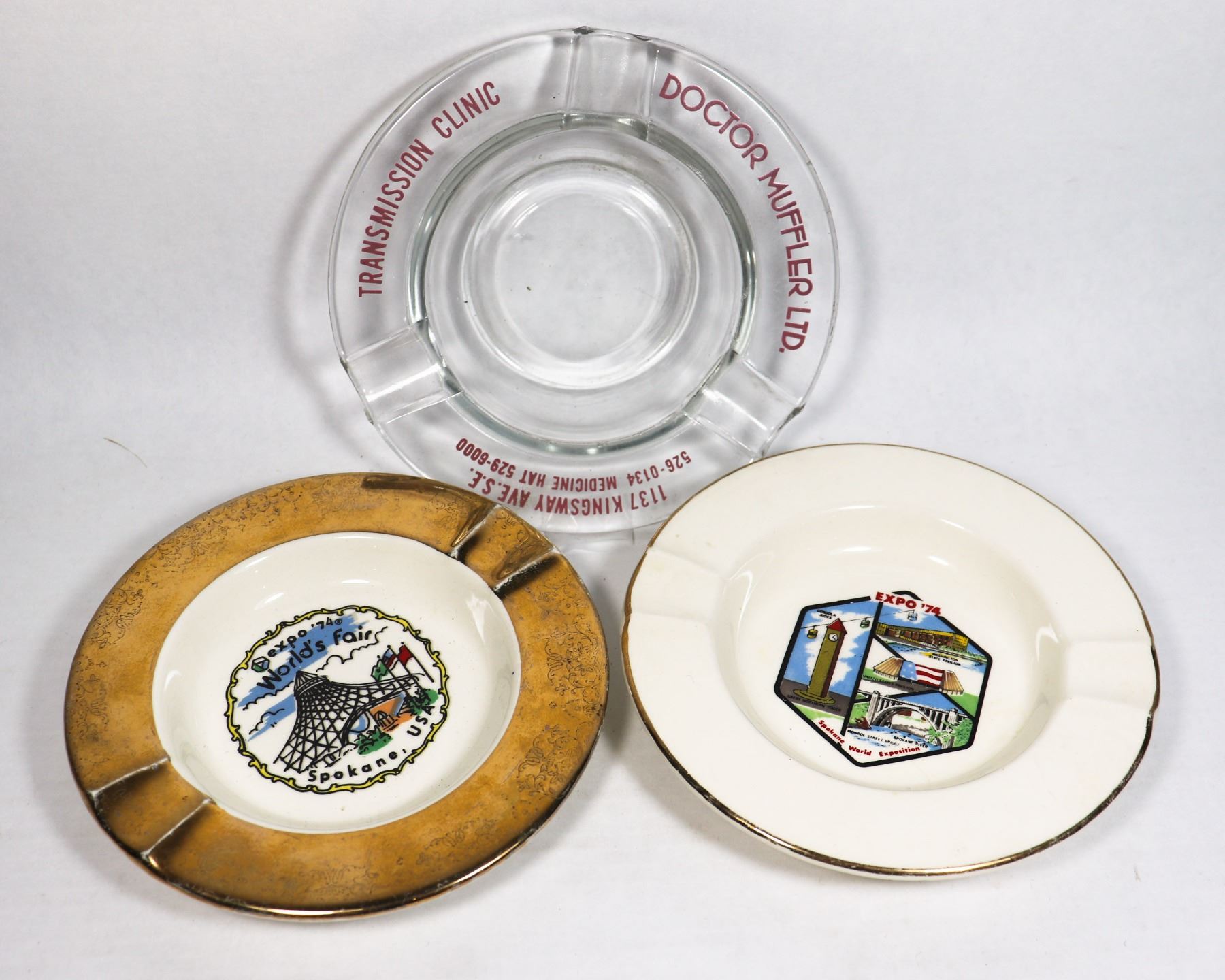 ALBERTA CANADA OIL & GAS AUTOMOTIVE GLASS ASHTRAY DOCTOR MUFFLER TRANSMISSION CLINIC AND 2 VINTAGE PORCELAIN ASHTRAYS INC. EXPO 1974