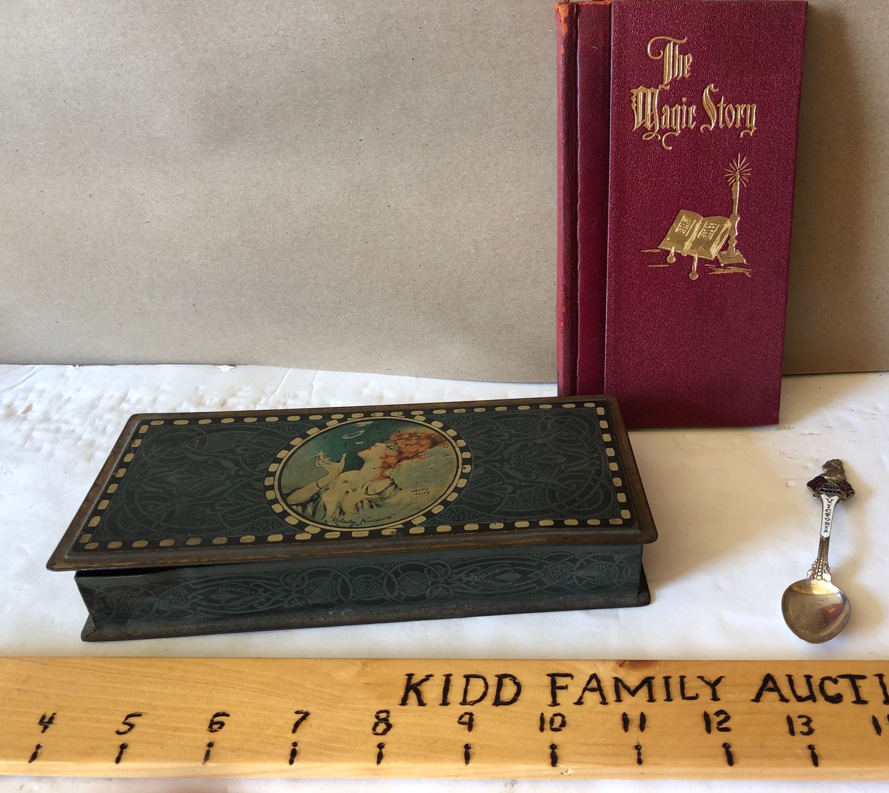 LOT OF 3, VINTAGE BEAUTY BOX, STERLING COLLECTOR SPOON, OLD BOOK