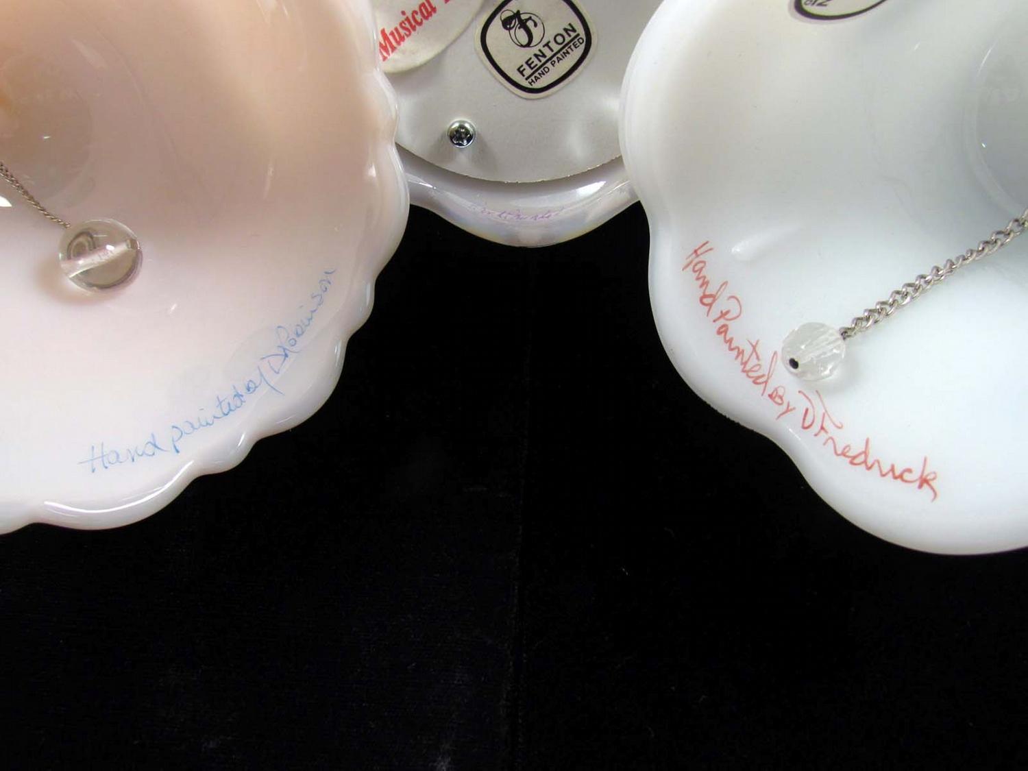 LOT OF 3 VINTAGE FENTON ART GLASS BELLS - HANDPAINTED AND SIGNED - One bell is musical