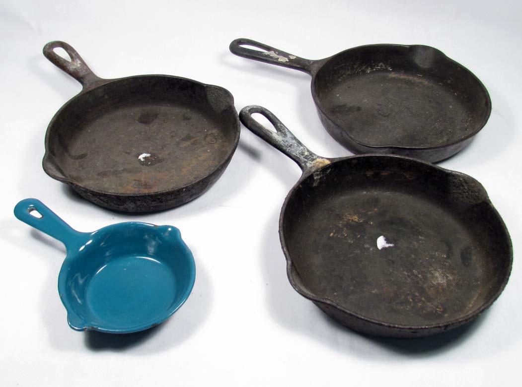 LOT OF 3 VINTAGE GRISWOLD NO. 3 SKILLETS AND 1 ENAMEL SKILLET