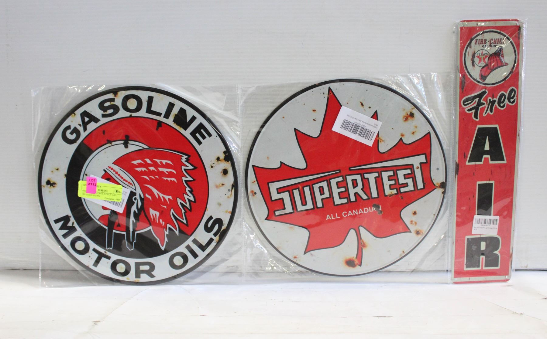 BRAND NEW, CIRCULAR SIGNS ARE 12 INCHES ACROSS, AIR SIGN IS 15.5 INCHES HIGH AND 3.75 INCHES WIDE