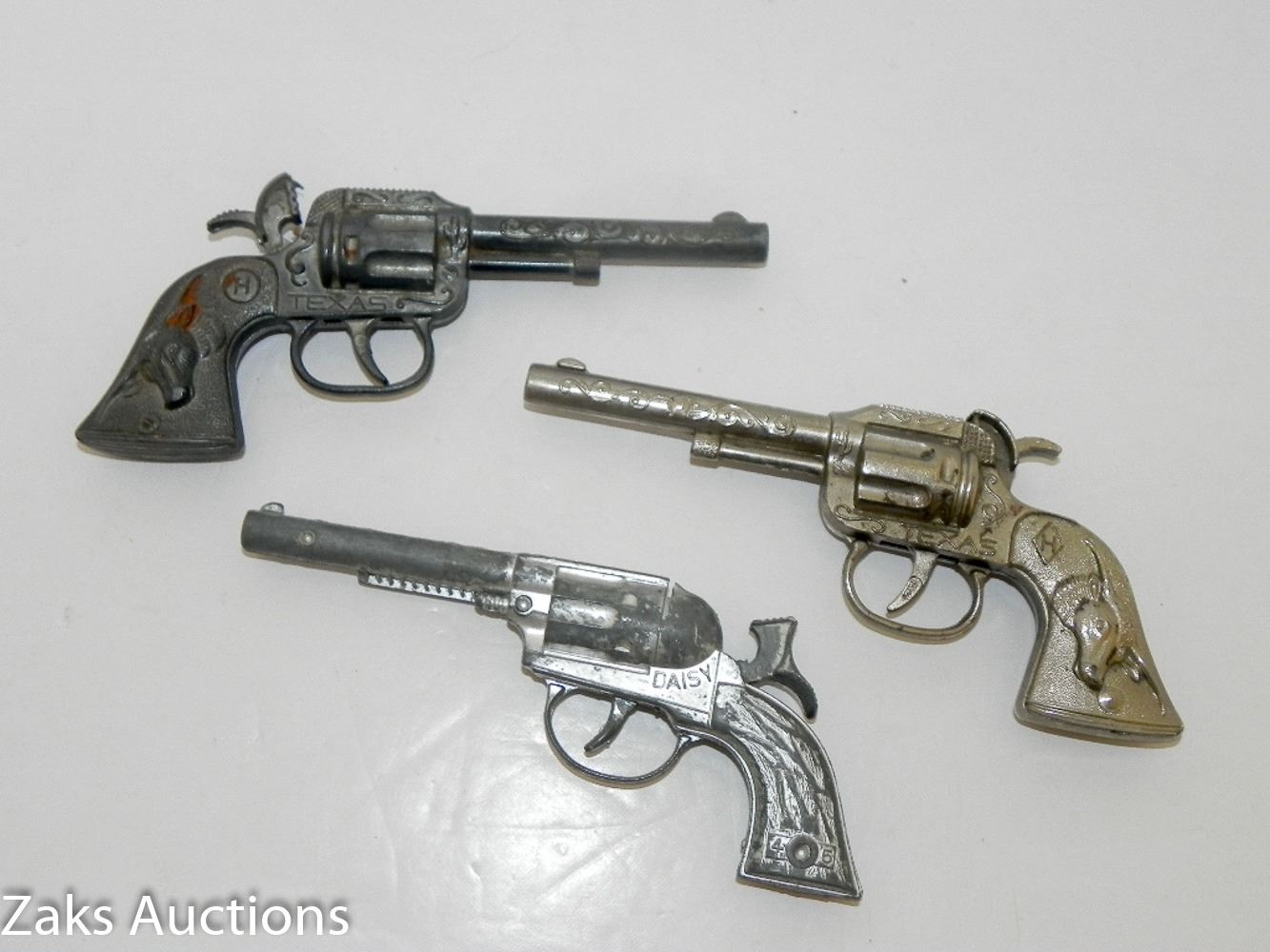 LOT OF 3 VINTAGE TOY REVOLVER GUNS. DAISY AND TEXAS X2