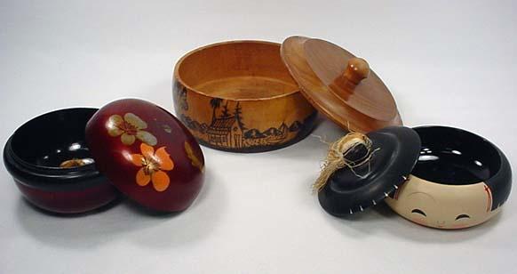 LOT OF 3 VINTAGE WOODEN POWDER BOXES - 1 Handle Needs Re-attaching