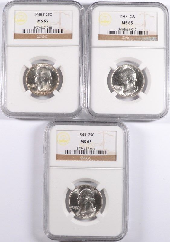 LOT OF ( 3 ) WASHINGTON QUARTERS NGC MS-65: 1945, 1947, AND 1948-S