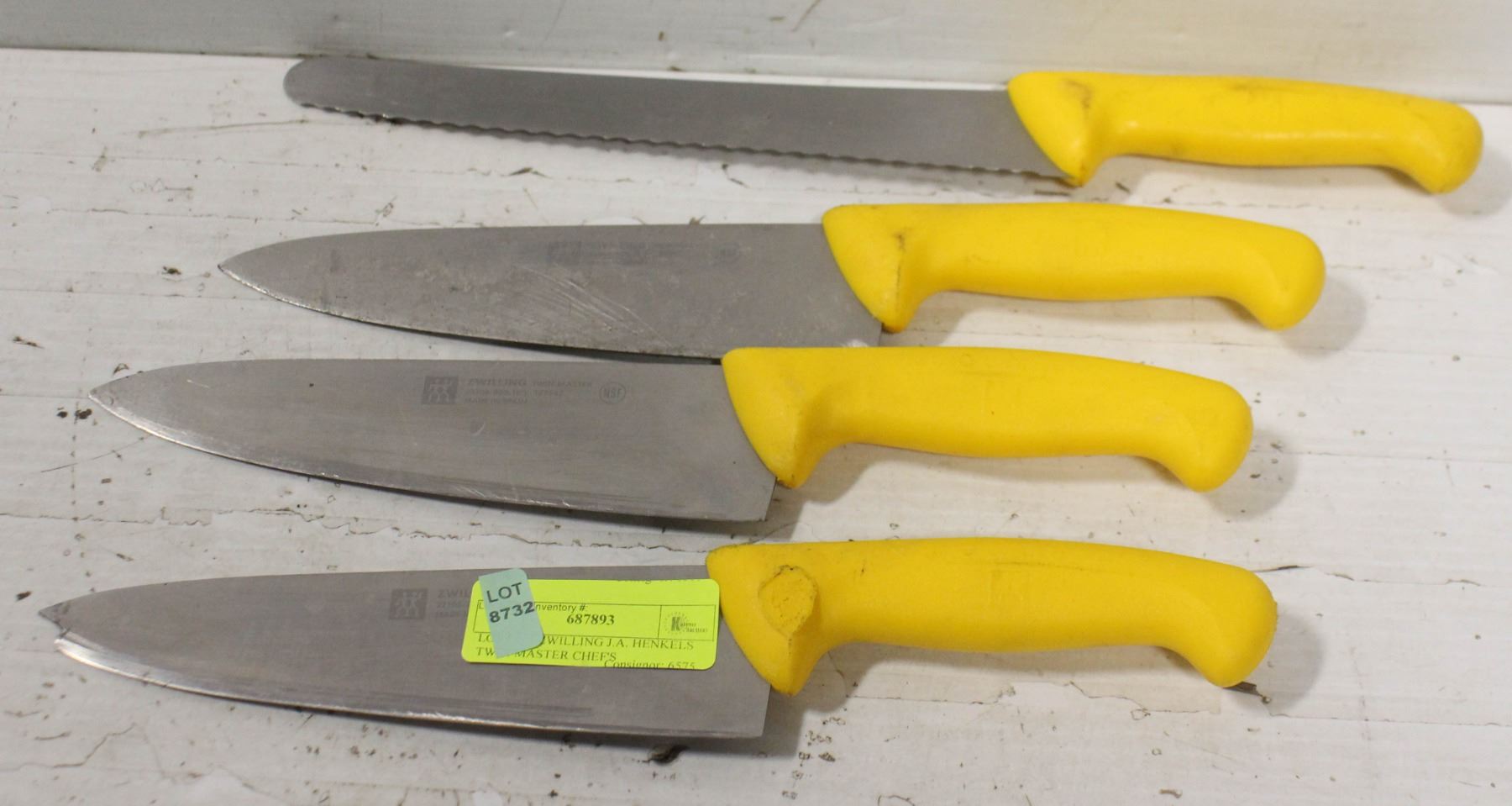 KNIVES & 1 SERRATED BREAD KNIFE. *AS IS, ONE CHEF'S KNIFE HAS TIP BROKEN OFF