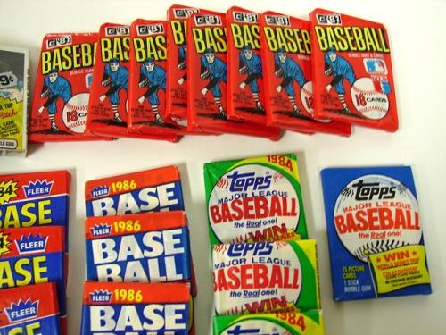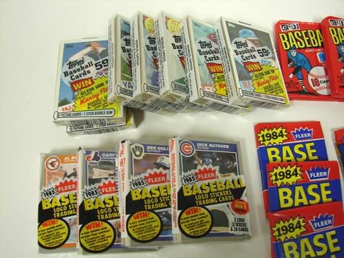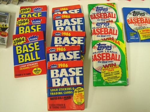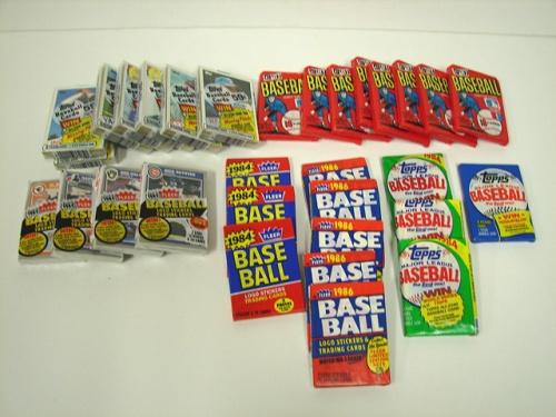 LOT OF 31 UNOPENED 1980S PACKS OF BASEBALL CARDS. Consists of 8 unopened wax packs of 1981 Donruss baseball cards, one unopened wax pack of 1983 Topps baseball cards, 3 unopened wax packs of 1984 Topps baseball cards, 3 unopened wax packs of 1984 Fleer baseball cards, 4 unopened clear plastic packs (28 cards each) of 1985 Fleer baseball cards, 7 unopened clear plastic packs (28 cards each) of 1985 Topps baseball cards, & 5 unopened wax packs of 1986 Fleer baseball cards.