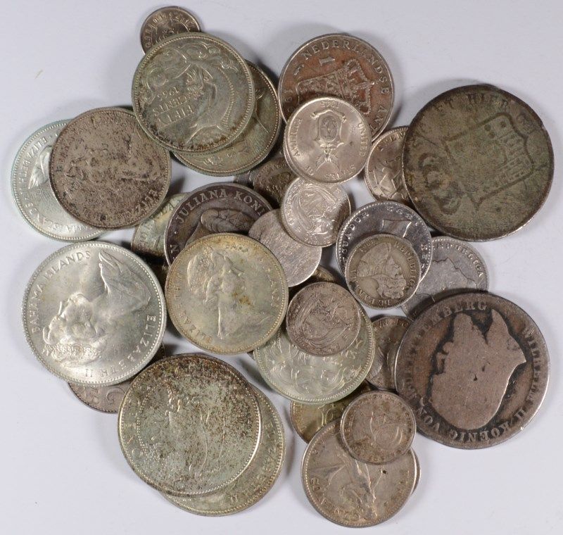 LOT OF ( 35 ) FOREIGN SILVER COINS, MANY LARGER & OLD COINS, APPROX. WEIGHT 280g