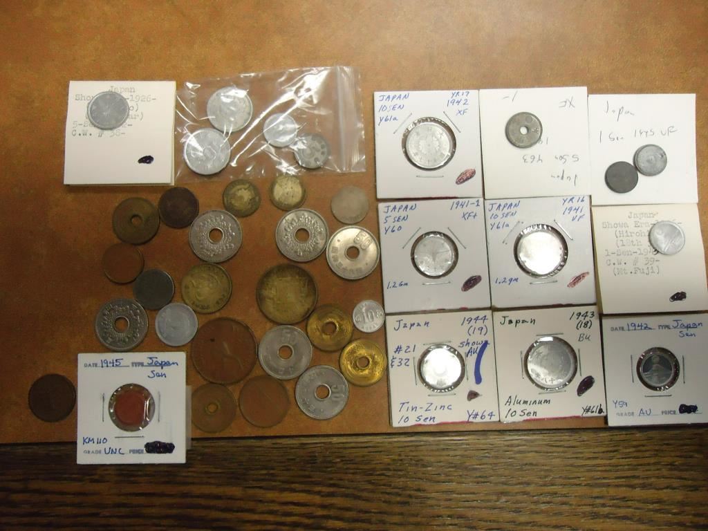 1863 JONESWOOD HOTEL MERCHANT TOKEN, 1945 JAPAN CLAY 1 SEN AND 37 OTHER COINS ABOUT HALF ARE WWII JAPANESE. LOOK THE MERCHANT TOKEN AND JAPANESE 1 SEN CLAY COIN