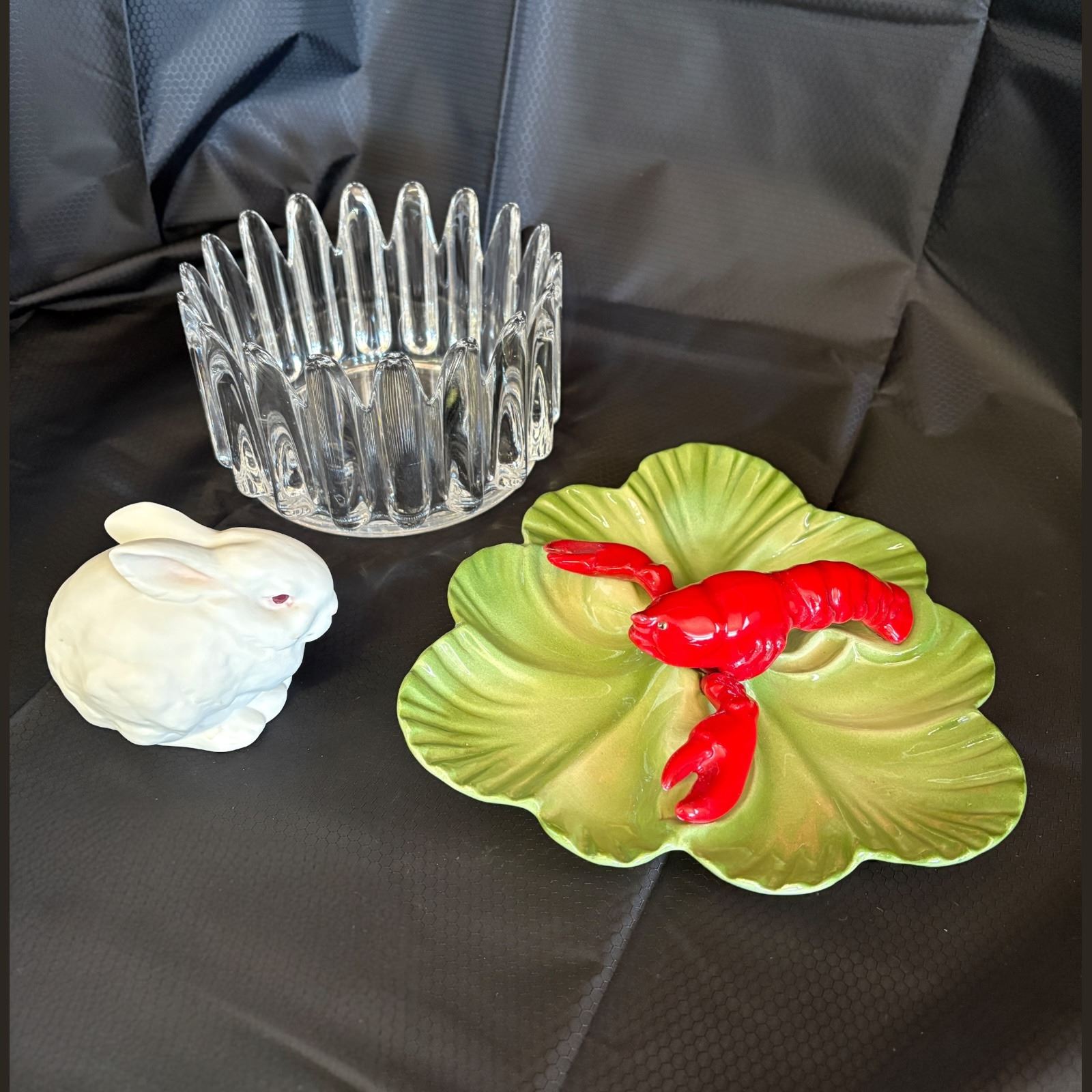 Lobster plate 9 in. diameter by Brad Keeler, crystal bowl 6.5 in. diameter, SIGNED Mr. Snowball figure
