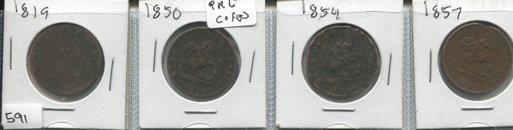 LOT OF 4 (1 HALF PENNIE TOKEN *1819*, 3 BANK OF UPPER CANADA HALF PENNIES *1850,. 1854, 1857*)