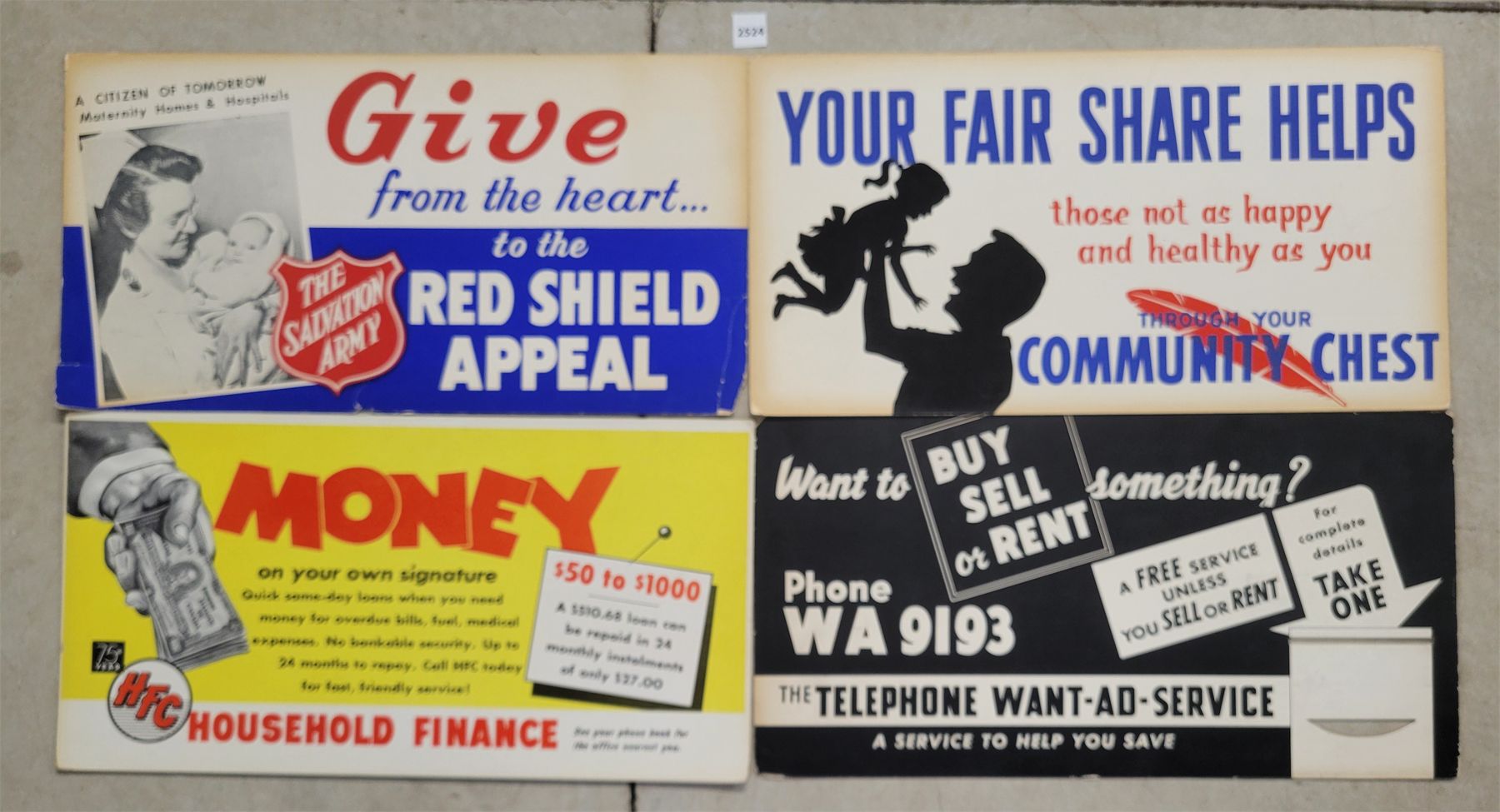 LOT OF 4 - ADVERTISING BOARDS - INCL SALVATION ARMY, COMMUNITY CHEST ETC.