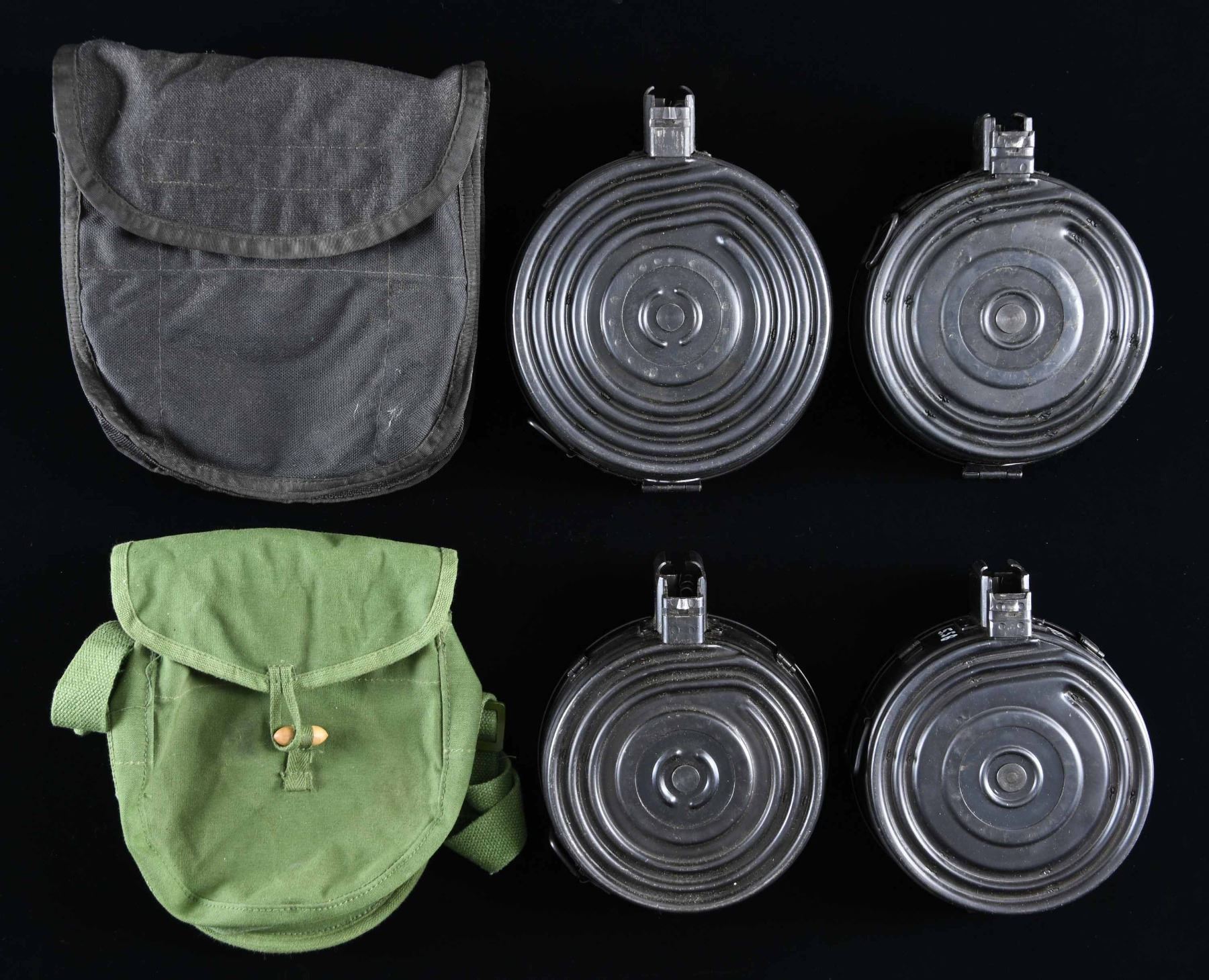 AK DRUM MAGAZINES. Lot of 4 assorted 5.56x45mm NATO and 7.62x39mm drum mags., including: 1) 2 unmarked 75-rd. 5.56x45mm NATO AK drum mags. 2) 1 Chinese Factory 9396 marked 75-rd. 7.62x39mm AK drum mag. with green canvas carrier. 3) 1 unmarked 100-rd. 7.62x39mm AK drum mag. with black nylon carrier. CONDITION: good to very good, with some light to mild wear and thinning, as well as some scattered superficial handling marks overall. (02-23736/MLW). $500-700.