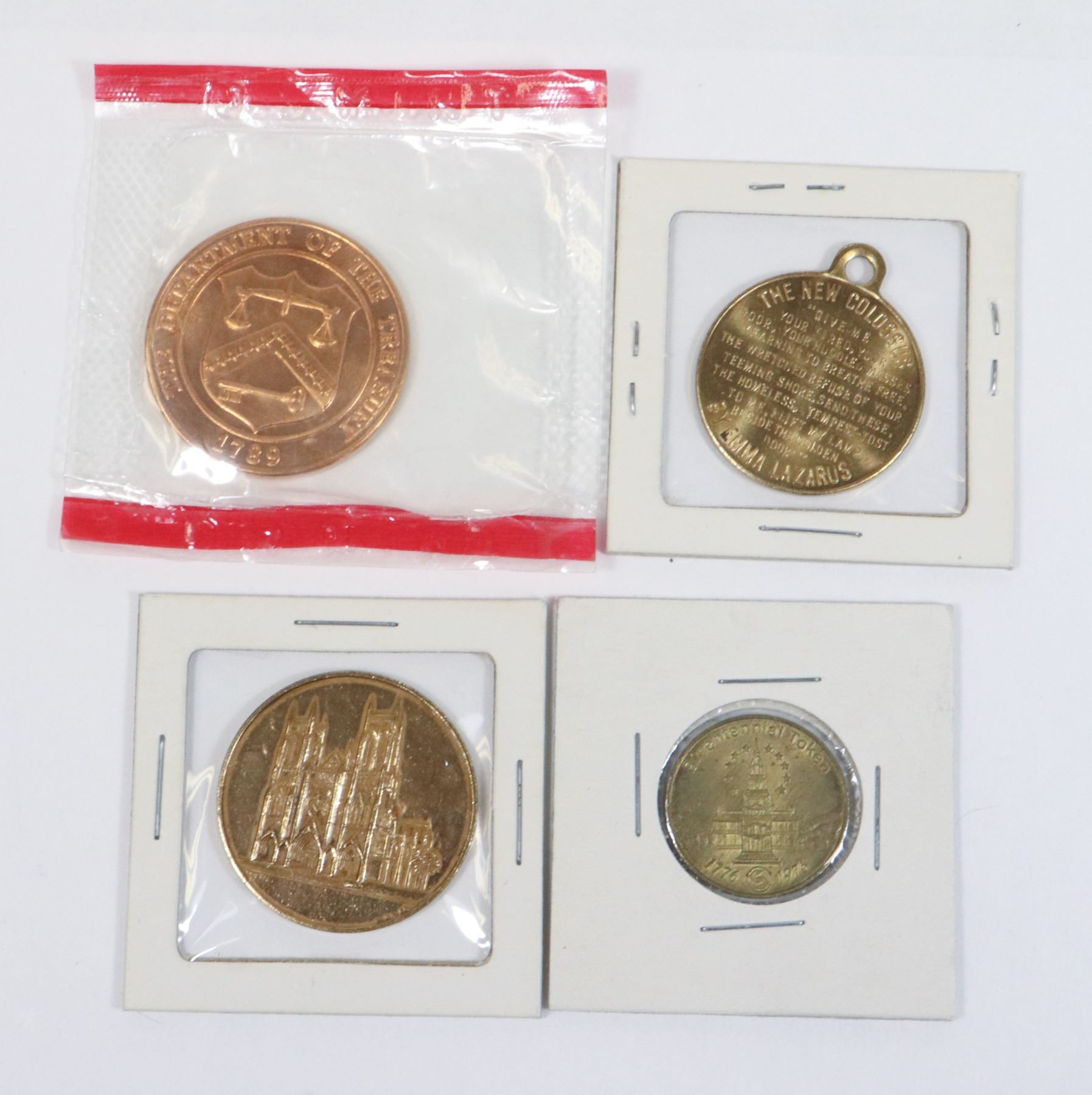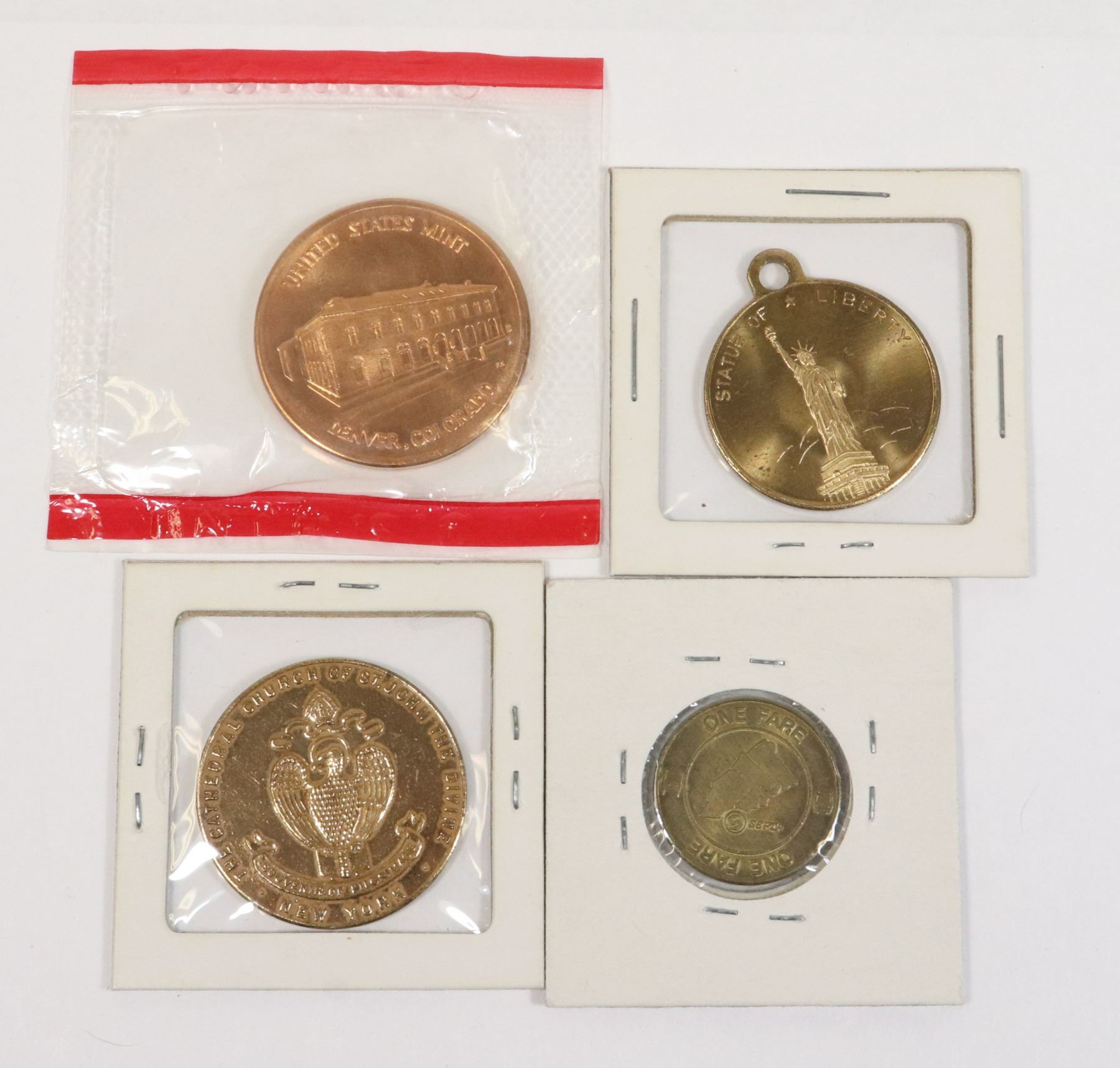 SEALED DEPARTMENT OF TREASURY USA TOKEN, STATUE OF LIBERTY NEW YORK TOKEN W/ LOOP, BICENTENNIAL TOKEN 1976 USA 1 FARE SEPTA, AND CATHEDRAL ST JOHN NEW YORK PILGRIMAGE TOKEN