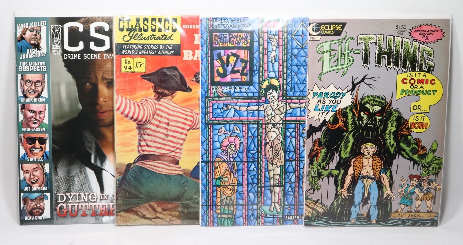 IDW CSI CRIME CENE INVESTIGATION CLASSIC ILLUSTRATED NO. 94 SCOTTRUSSO'S JIZZ NO.7 FANTAGRAPHICS BOOKS ECLIPSE COMICS ELF-THING***ITEM(S) LOCATED IN LETHBRIDGE ALBERTA, FREE TRANSPORT TO OUR EDMONTON OFFICE AVAILABLE. WORLDWIDE SHIPPING IS AVAILABLE***