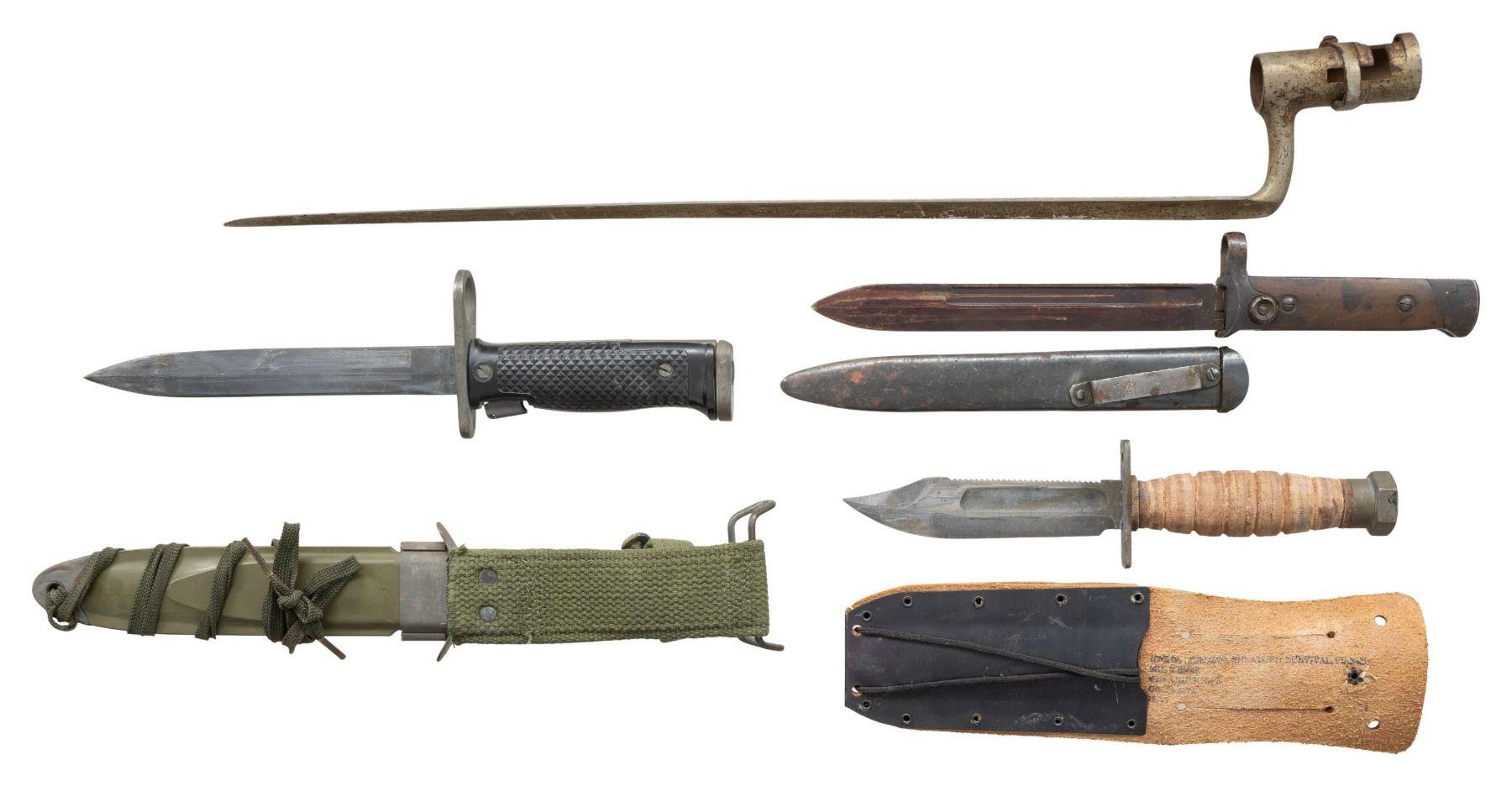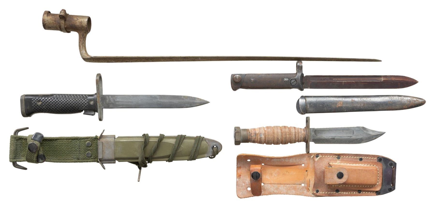 This lot consists of the following: 1) Italian 1938 Folding Bayonet with scabbard. Blade shows wear from sharpening, dings & oxidation. 2) US M6 Bayonet. Crossguard marked Milpar. TWB M8A1 scabbard with frog present. CONDITION: metal parts of bayonet show white staining, staining & silvering. Grips show handling wear. Scabbard shows white staining. 3) Ontario Pilot Survival Knife. 10-76 dated knife with tan scabbard & sharpening stone. CONDITION: blade is turning gray with sharpening wear & scratches. Other parts also turning gray with oxidation & white staining. Scabbard & handles show white staining & flaking. 4) US M1855 bayonet. No scabbard or frog present. CONDITION: bayonet shows overall oxidation. (02-25112/MJC). NON-GUN. $100-200 for lot.