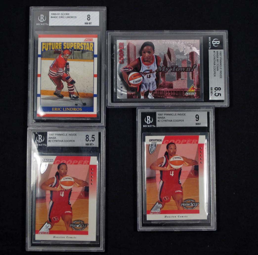 1990-91 Score No. 440C Eric Lindros Hockey Card - 8 NM-MT, 1997 Pinnacle Inside WNBA My Town No. 7 Cynthia Cooper Basketball Card - 8.5 NM-MT+ and 2 1997 Pinnacle Inside WNBA No. 2 Cynthia Cooper one graded 8.5 NM-MT+ and the other graded 9 Mint.