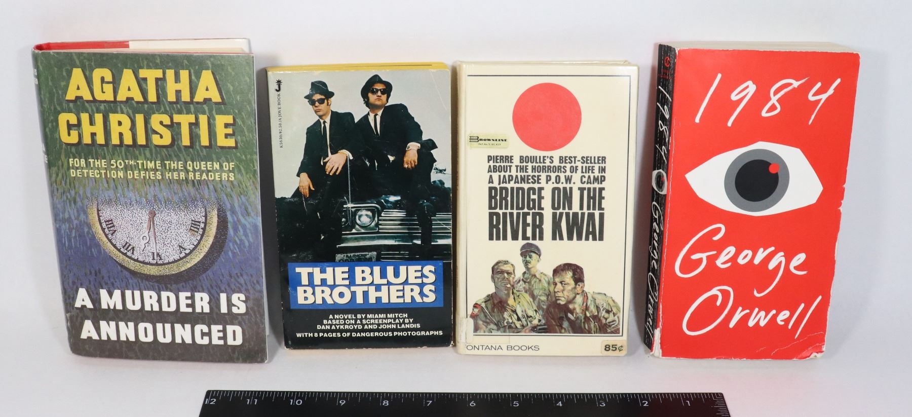 1984 BY GEORGE ORWELL, A MURDER IS ANNOUNCED BY AGATHA CHRISTIE, THE BLUE BROTHERS BY MIAMI MITCH, BRIDGE ON THE RIVER KWAI BY PIERRE BOULLE