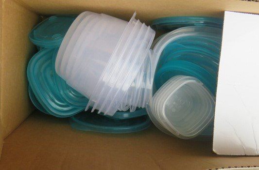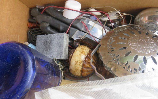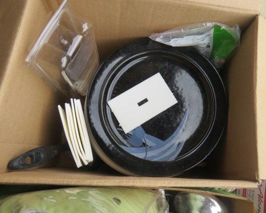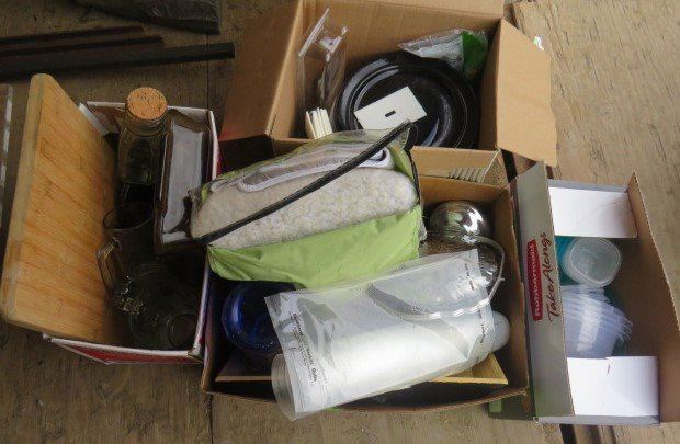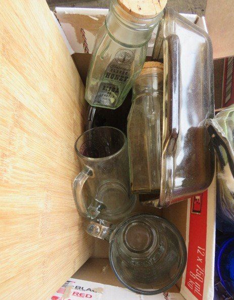 LOT OF 4 BOXES MISC KITCHEN WARE (PLATES, CUTLERY, KNIVES, MUGS, CUTTING BOARD, ETC)