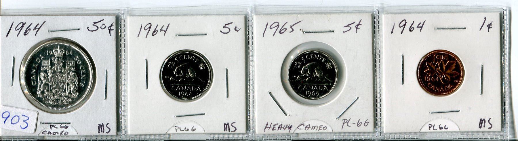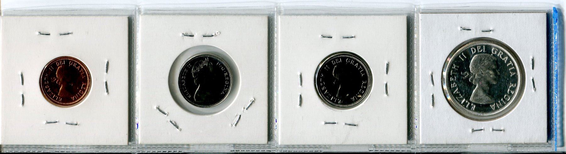 LOT OF 4 CANADIAN COINS (FIFTY CENT 1964, 2 X NICKLE 1964-65-SILVER) *PENNY 1964*