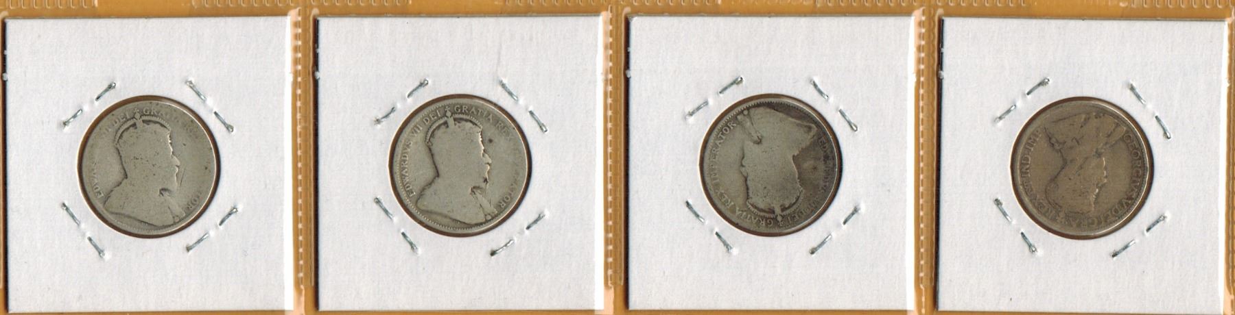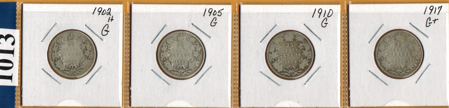 LOT OF 4 CANADIAN SILVER 25 CENT COINS (1902, 05, 10, 17)