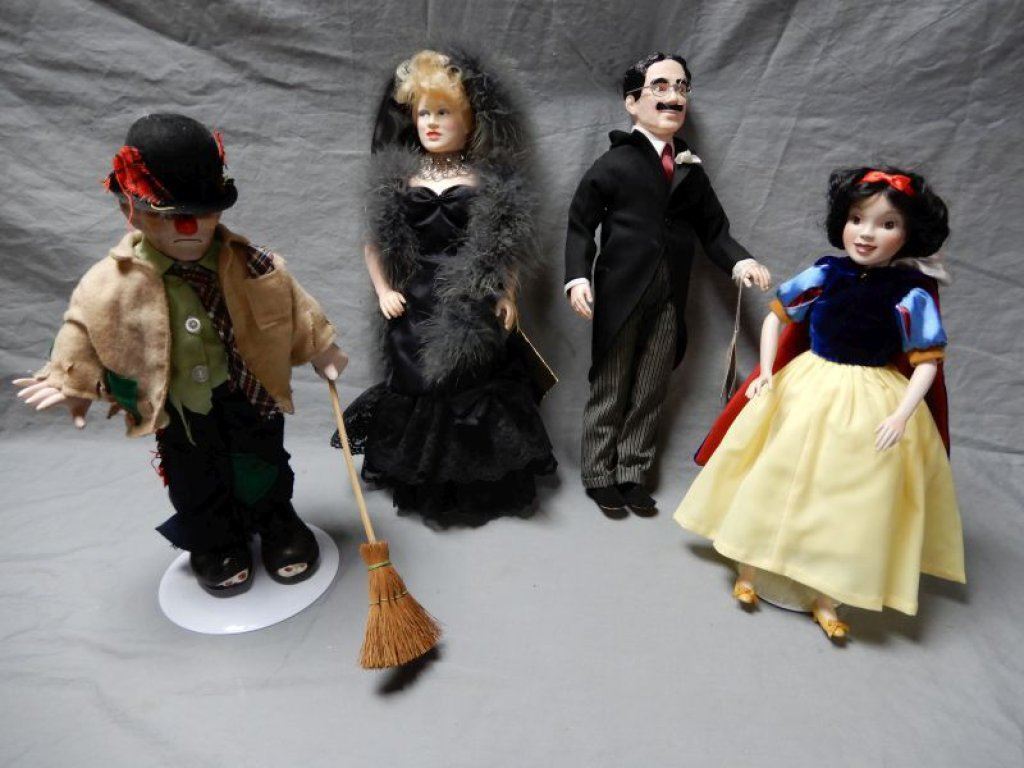 LOT OF 4 COLLECTIBLE DOLLS PORC SNOW WHITE WITH STAND PORC HOBO WITH STAND PORC MAE WEST RUBBER GROUCHO MARX LOCATION: UPPER OFFICE