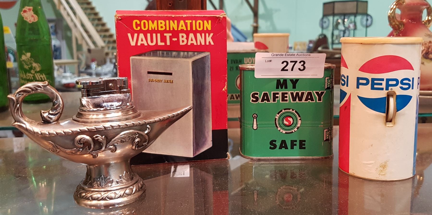 VINTAGE VAULT BANK IN BOX, SAFEWAY COIN BANK, GENIE LAMP TABLE LIGHTER, & PEPSI CAN RADIO