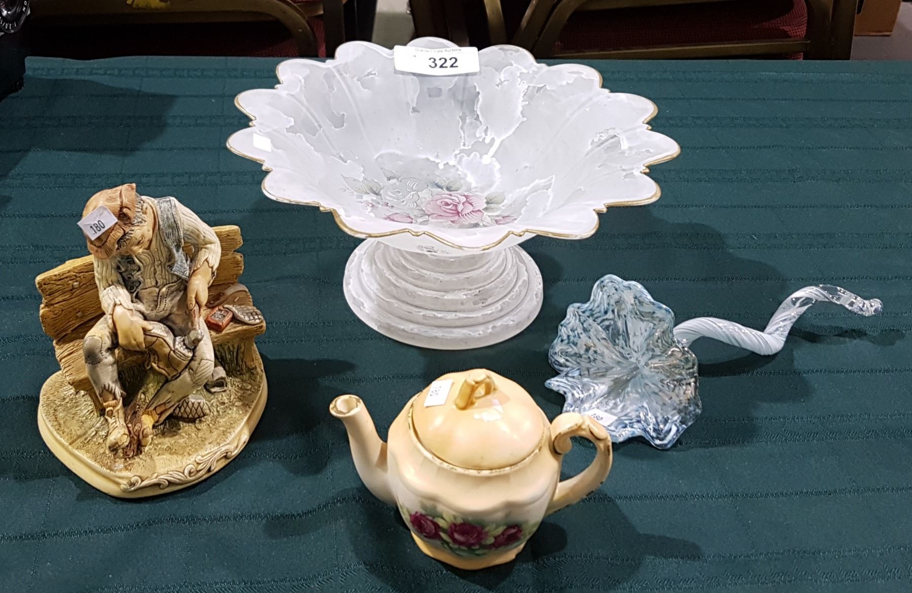 VICTORIAN PORCELAIN TEAPOT, ART GLASS FLOWER, GLASS COMPOTE, AND NATURE CRAFT SCULPTURE