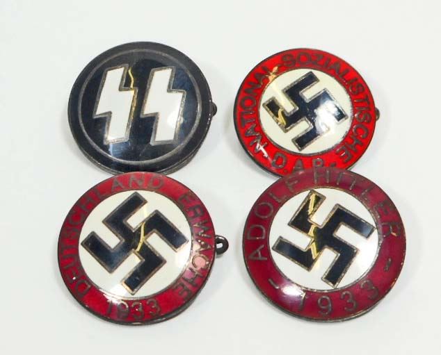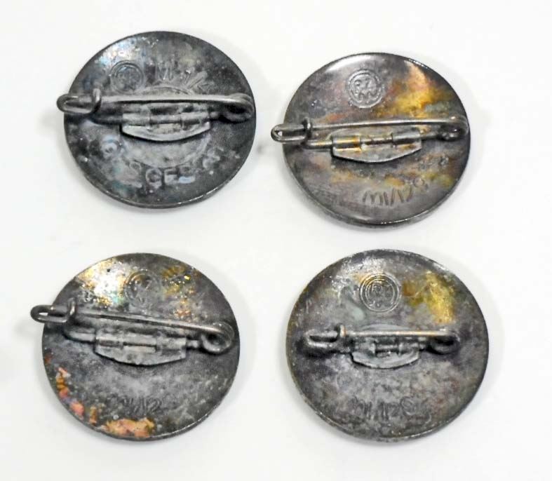 They measure 1" in diameter. This grouping includes: SS; Adolf Hitler 1933; Deutschland Erwache 1933; NSDAP. All are 'RZM' maker marked. They have a thin horizontal pin back. Nickel construction with enamel.