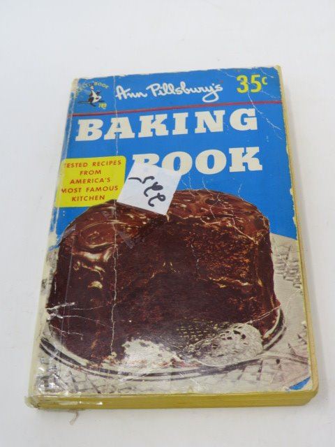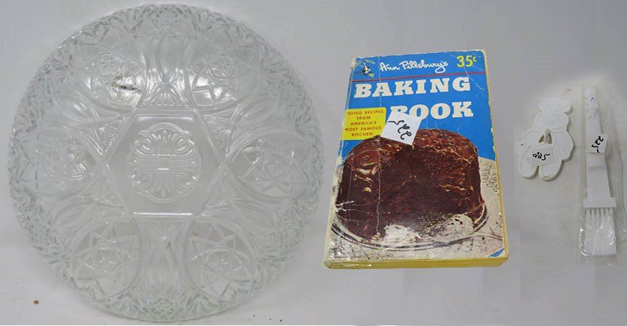 LOT OF 4 - GLASS SERVING DISH, ANN PILSBURY BAKING BOOK (1951), PILLSBURY COOKIE CUTTER & BASTING BRUSH