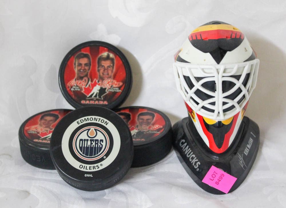 LOT OF 4 HOCKEY PUCKS & COLLECTIBLE MASK