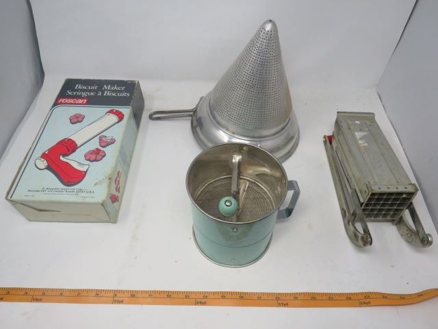 LOT OF 4 KITCHEN UTENSILS (VINTAGE) *METAL FRY MAKER* (BISCUIT MAKER)