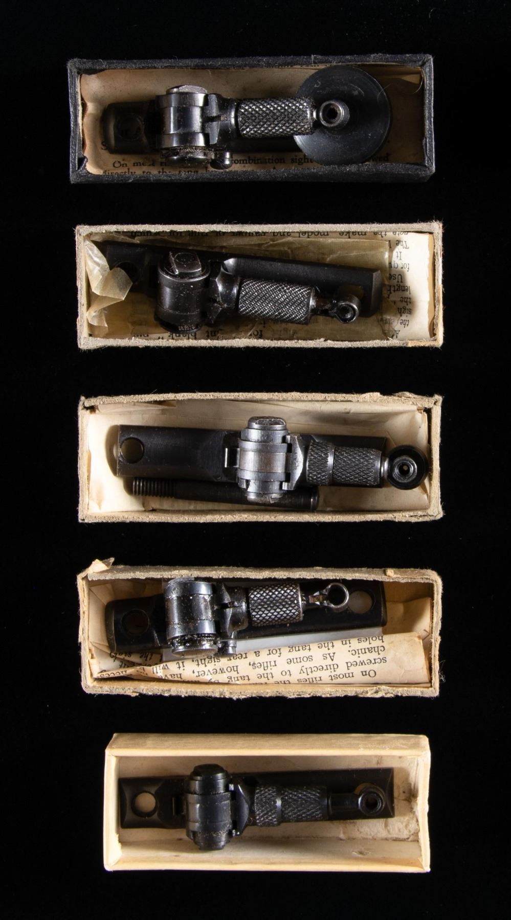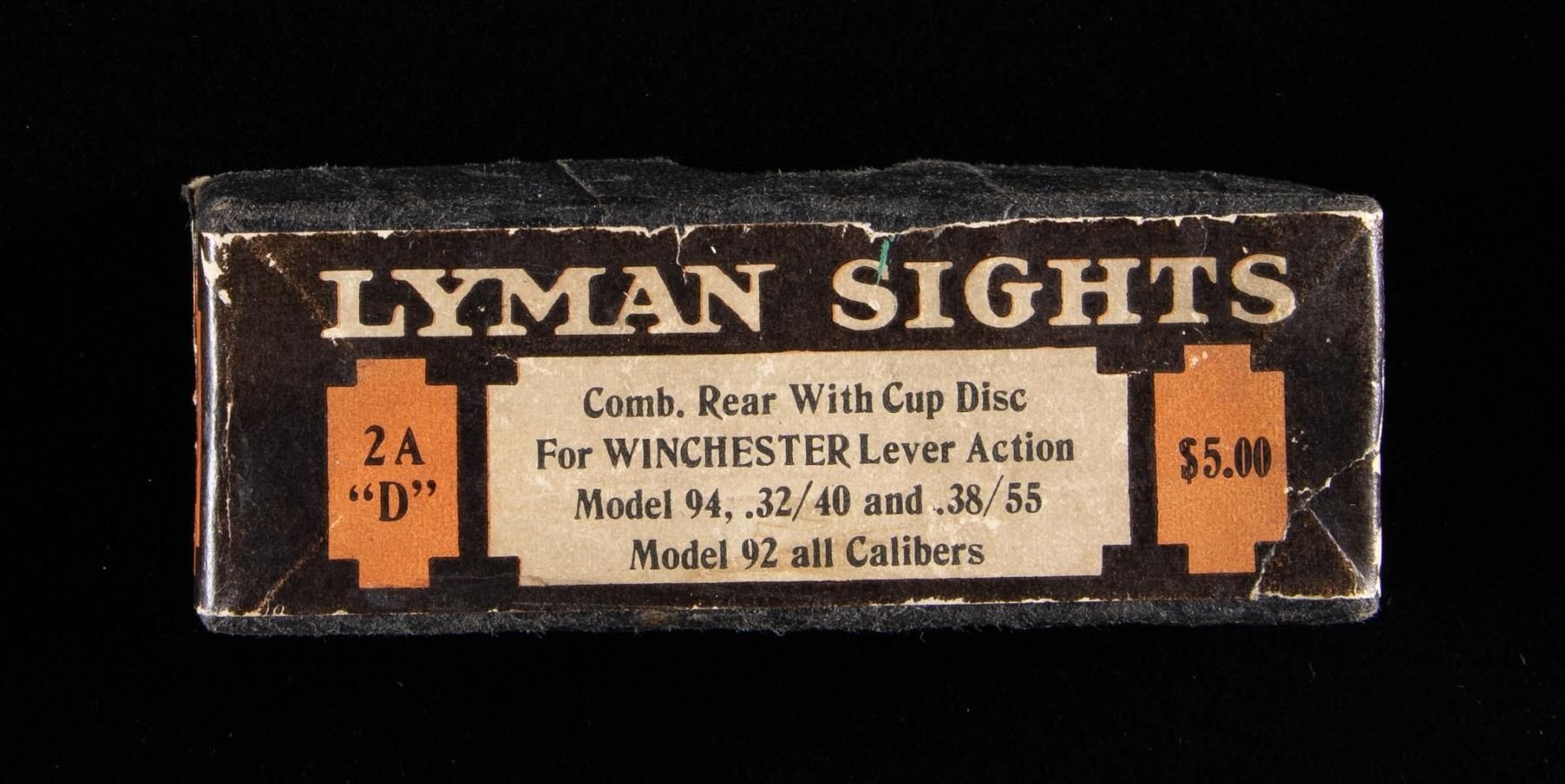 Lot consists of: 1) Lyman No. 1A "D" combination sight for Winchester Model 94 .32-40 & .38-55, as well as all calibers of the Model 92. Mounting screws included. Sight is housed within its original 2-piece box with proper label including instructions. CONDITION: over 95% original blue. Box is in good condition showing slight wear on the label. 2) Lyman No. 1A "DA" combination tang sight for Winchester Model 94 .25-35, .30-30, and .32 Special, along with Model 53 and 55 rifles. Rear mounting screw is included. Sight is housed within its original 2-piece box with instructions. This is actually a marble sigh in an incorrect Lyman box. The bottom appears to be an incorrect factory stamping "W1". Correct stamping apparently should be "W11" or "W12". CONDITION: 90% original blue. Box has light wear with a small piece of the label missing. 3) Lyman No. 2A "D" combination rear sight with cup disc for Model 94 .32-40 & .38-55, and all calibers of Model 92 rifles. Mounting screws are not included. Sight is housed within its original 2-piece box with instructions. CONDITION: sight retains over 90% blue. Box shows light wear with a partially torn end label. 4) Lyman No. 1A "DA" combination tang sight for Winchester Model 94 .25-35, .30-30, and .32 Special, along with Models 53 and 55 rifles. Mounting screws are included. Sight is housed within its original 2-piece box with instructions. CONDITION: sight retains 90% original blue. Box shows light handling marks. 5) Marbles flexible rear sight for Winchester rifles. Rear of sight is marked "W1". Attachment screws are not included. Sight is housed within an original 2-piece box with original label. Label is marked "No. W2 PG" for Winchester Model 1894 .38-55 and Model 1892 all calibers. CONDITION: sight retains over 95% blue. Box has 1 torn end flap. (02-25105/DS). NON-GUN. $1,200-1,500.