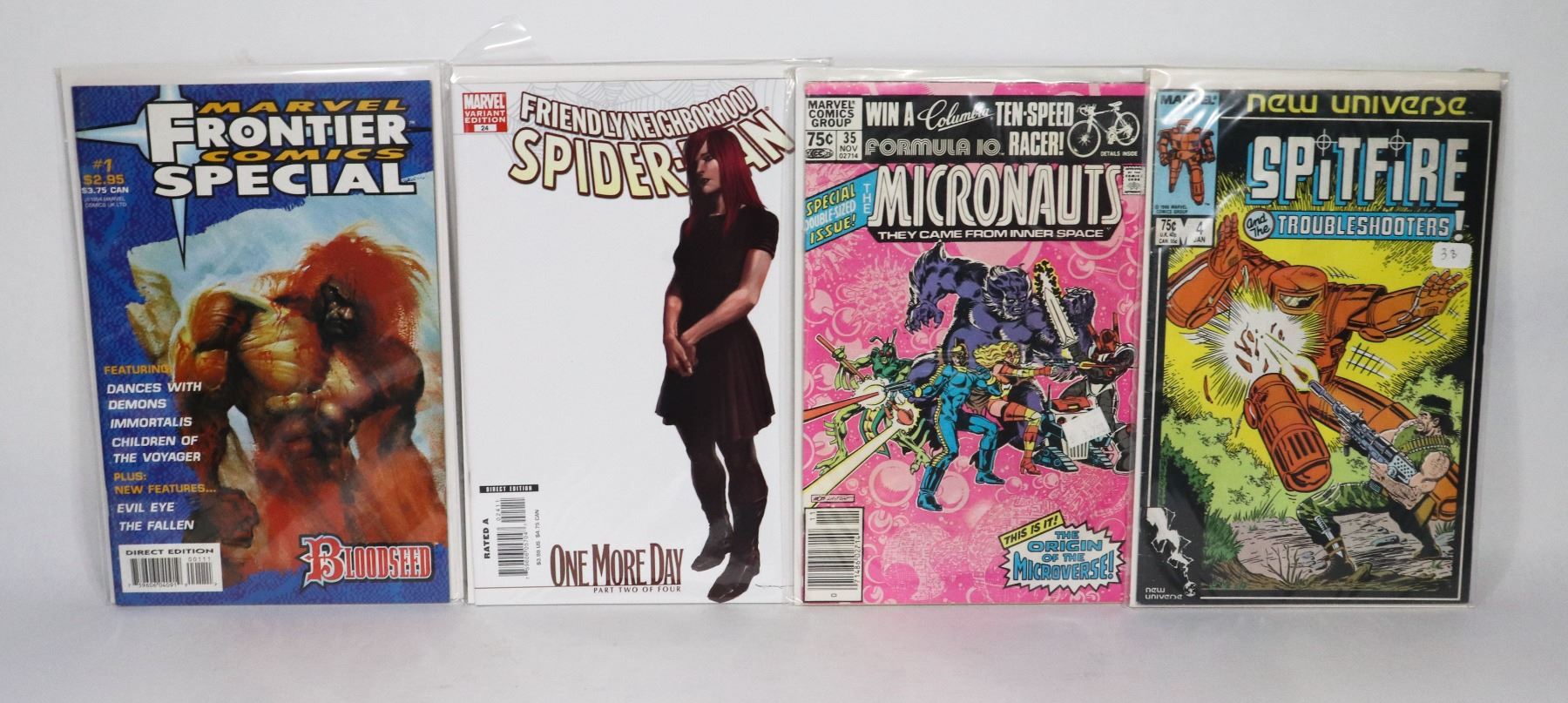 SPITFIRE AND THE TROUBLE SHOOTERS #4 THE MICRONAUTS #35 FRIENDLY NEIGHBORHOOD SPIDERMAN #24 MARVEL FRONTIER COMICS SPECIAL #1***ITEM(S) LOCATED IN LETHBRIDGE ALBERTA. SMALL ITEMS ONLY ARE AVAILABLE FOR FREE TRANSPORT TO EDMONTON OFFICE (READ AUCTION DETAILS FOR MORE INFORMATION)
