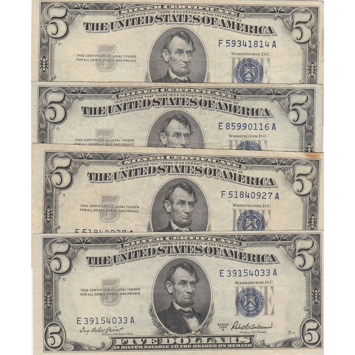 LOT OF 4 NICE APPEALING $5 SILVER CERTIFICATES 1953