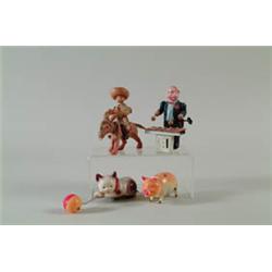 Lot # 946 LOT OF 4 OCCUPIED JAPAN TOYS. 1) Celluloid kitty chases ball. 2) Vibrating pig with squeak bellows. 3) Native with sombrero on Donkey. 4) Celluloid figure in tux plays metal xylophone. SIZE: Tallest 6". CONDITION: Lot averages very good to near excellent and working. 1-29367 (300-500)
