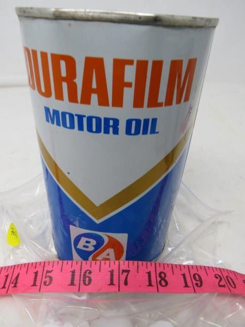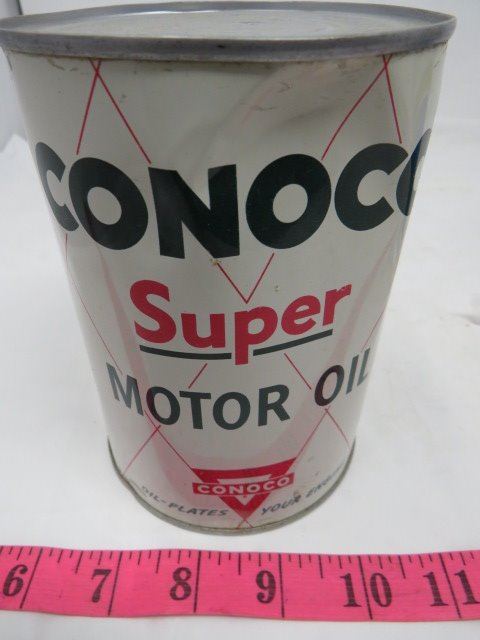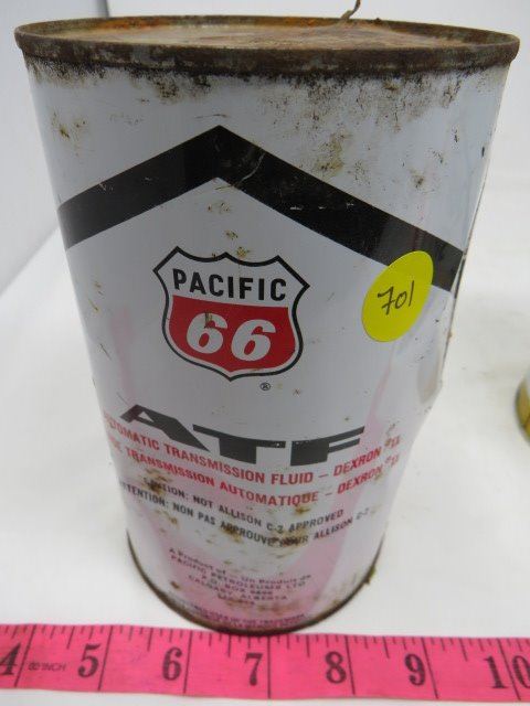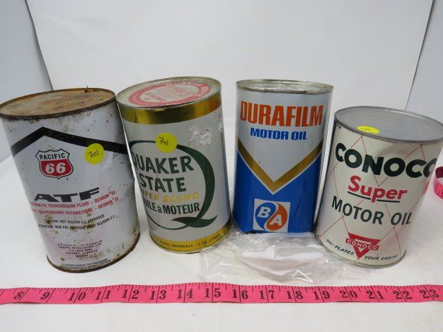 LOT OF 4 OIL CANS (CONOCO SUPER MOTOR OIL-FULL, QUAKER STATE SUPER BLEND-FULL, DURAFILM-LEAKING BUT FULL, PACIFIC 66 ATF)