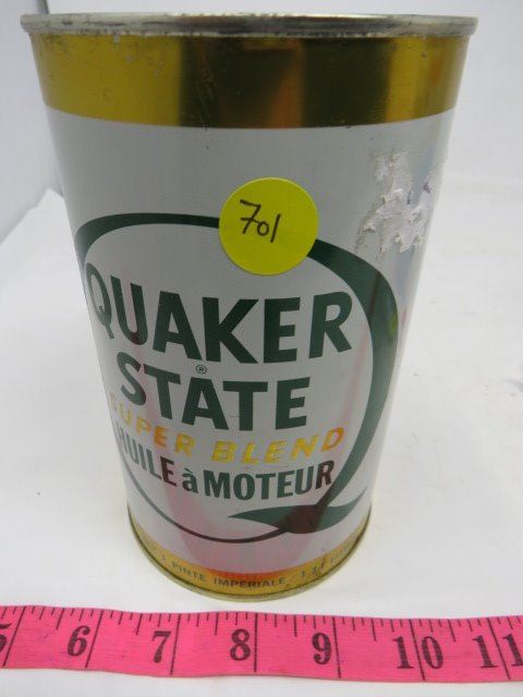LOT OF 4 OIL CANS (CONOCO SUPER MOTOR OIL-FULL, QUAKER STATE SUPER BLEND-FULL, DURAFILM-LEAKING BUT
