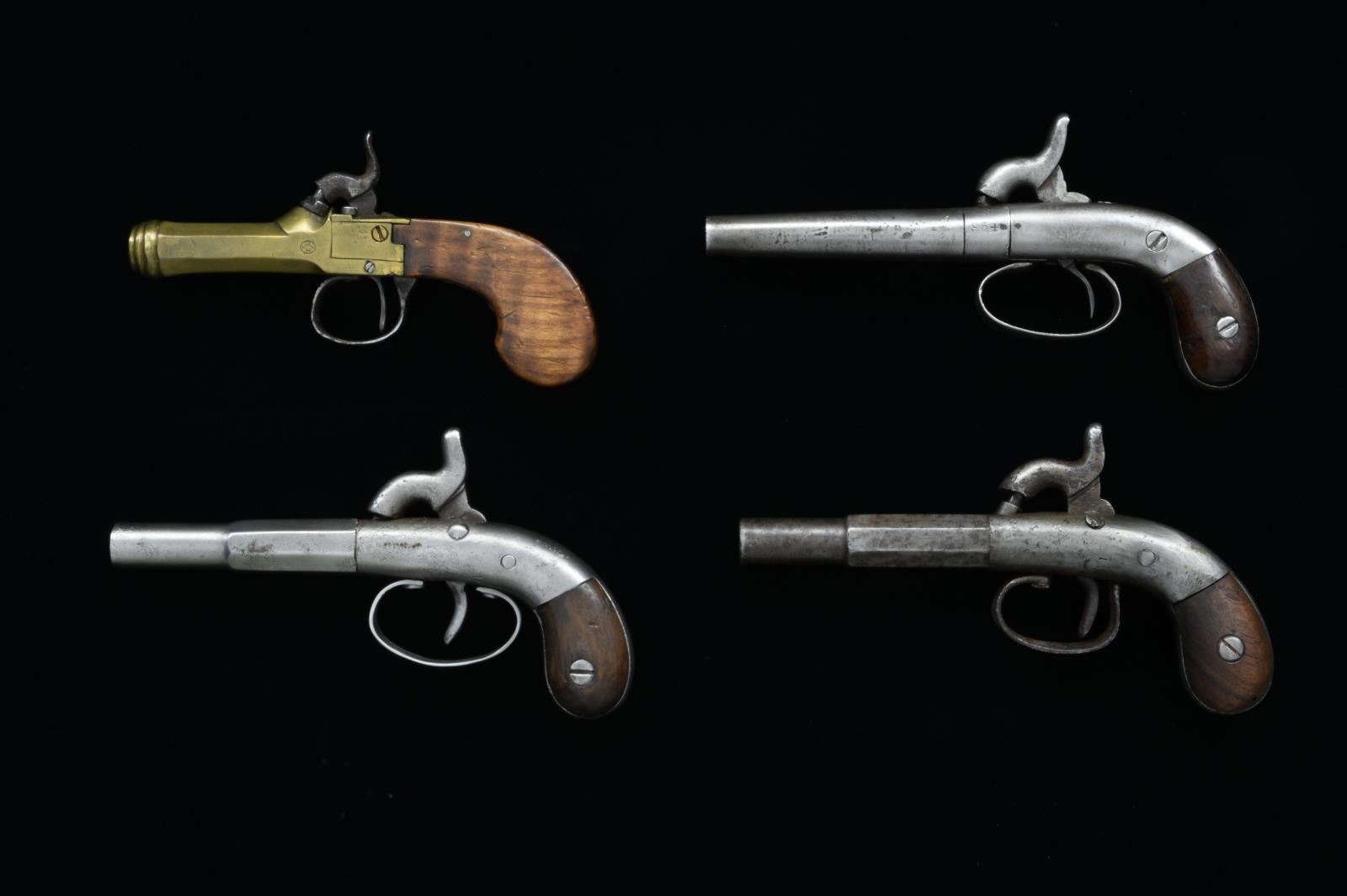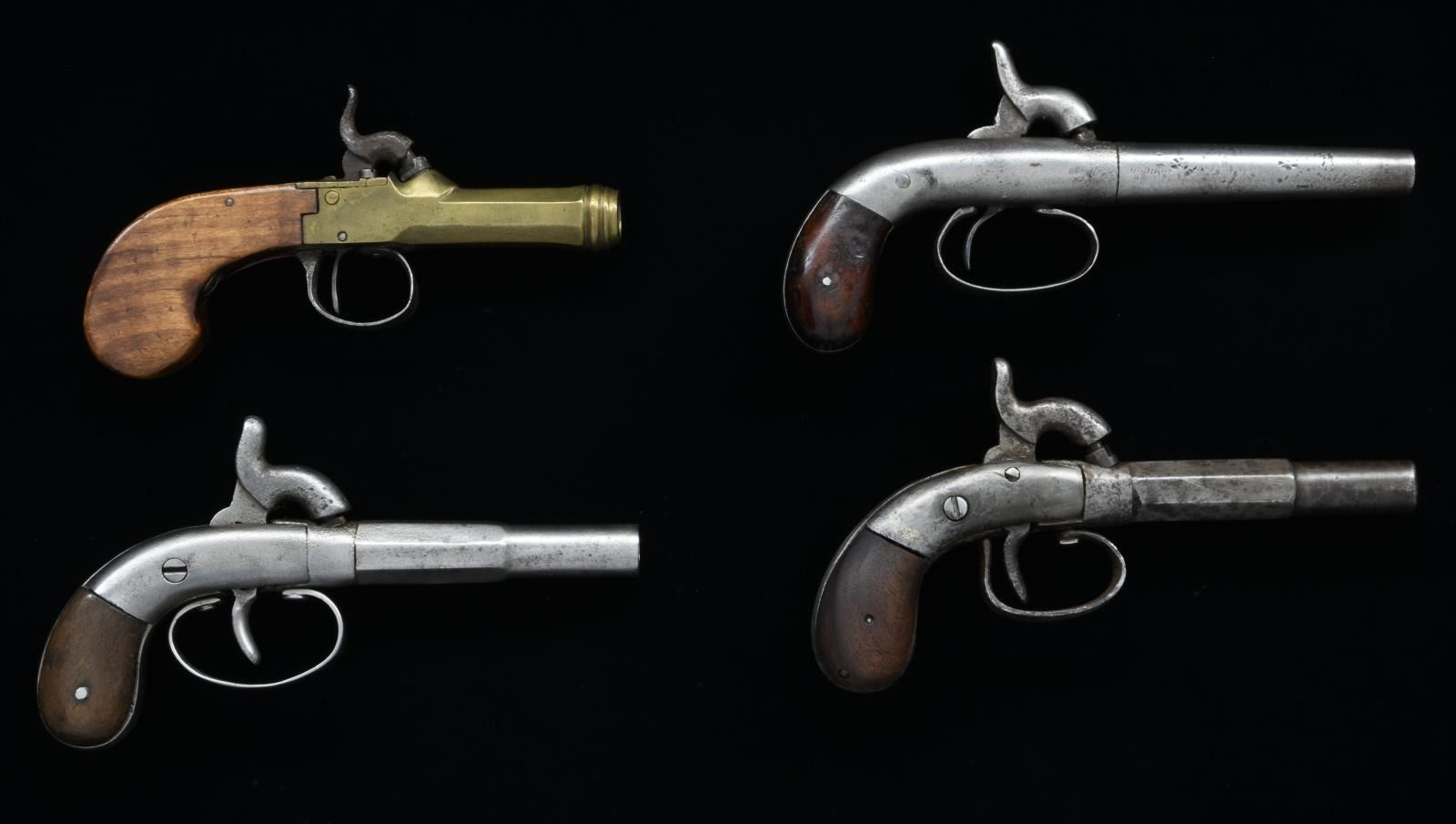 1. Cal. 32. NSN. Bbl. 3" half-oct half-rnd smoothbore. No visible markings. Smooth hardwood grips. CONDITION: grips display a loose fit w/ some handling marks. Metal is a gray patina w/ scattered pitting, dings & oxidation. Oxidized bore. 2. Cal. 41. NSN. Bbl. 2 1/2" oct . Left side of bbl. has circled Belgian "E/LG" proof. Brass frame & bbl. Smooth hardwood grip assembly. CONDITION: grip shows scattered dings & handling wear. Metal shows scattered dings, oxidation & pitting. Oxidized ore. 3. Cal. 38. S# NSN. Bbl. 3" half-oct half rnd. smoothbore. No visible markings. Hardwood grips. CONDITION: grips show some chipping, dings & handling wear. Metal has a silvery cleaned appearance w/ scattered dings, pitting & oxidation. Bore shows scattered pitting. 4. Cal. 32. S# 854. Bbl 3" smoothbore. Aside from "854" no other visible markings. Walnut grips. CONDITION: grips show a couple cracks, scattered abrasions & handling wear. Metal is a silvery-gray patina w/ scattered dings, pitting & oxidation. Oxidized bore. (01-23655/MJC). ALL ANTIQUE. $200-300.