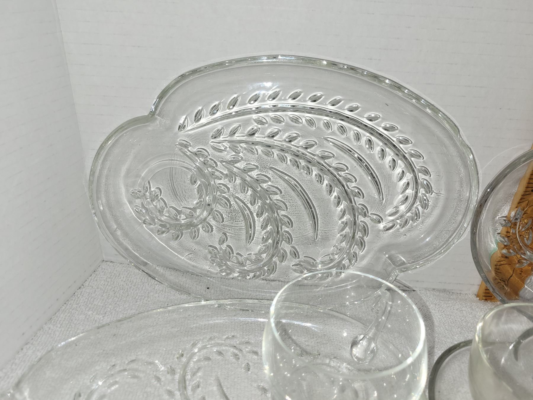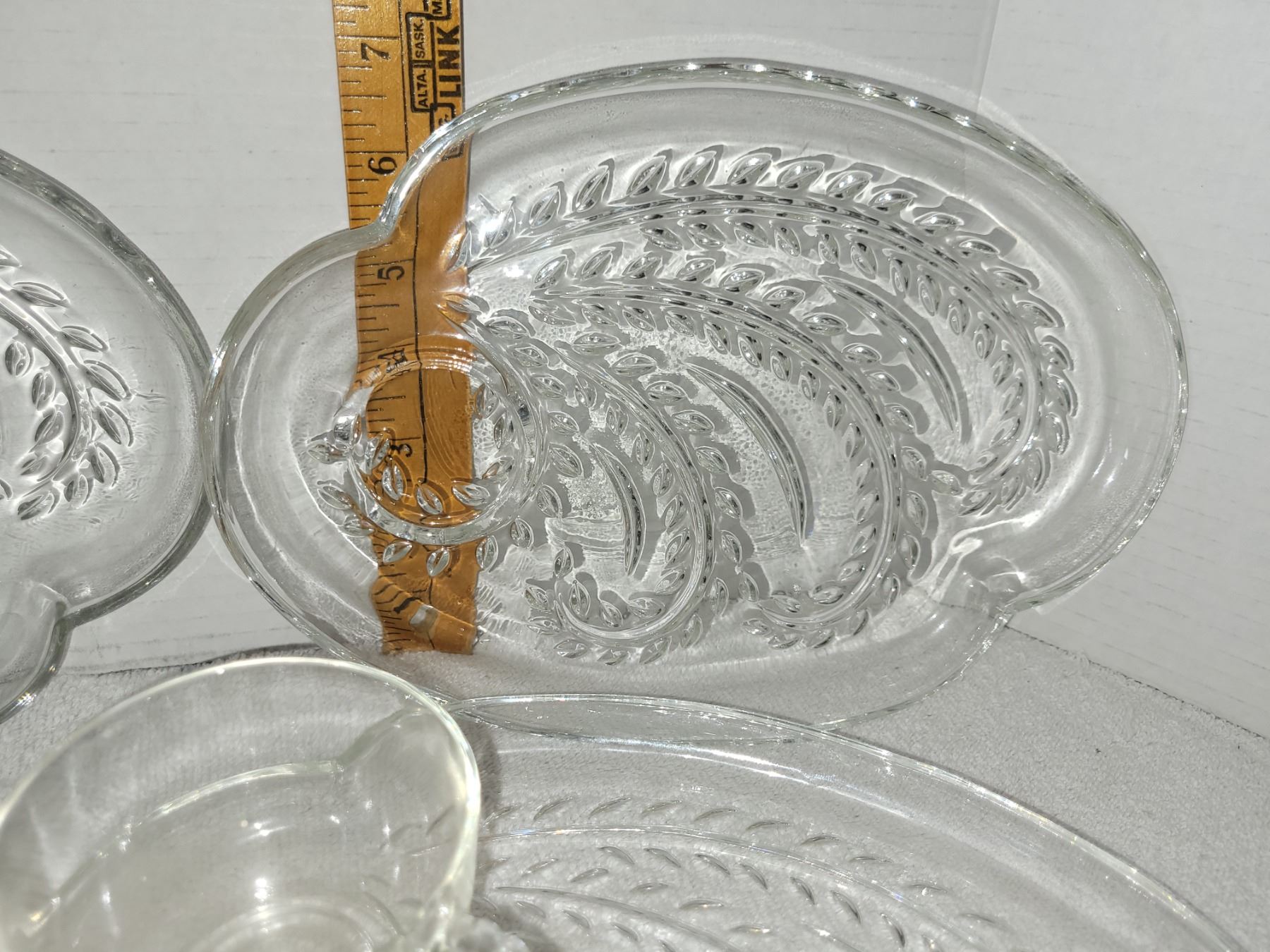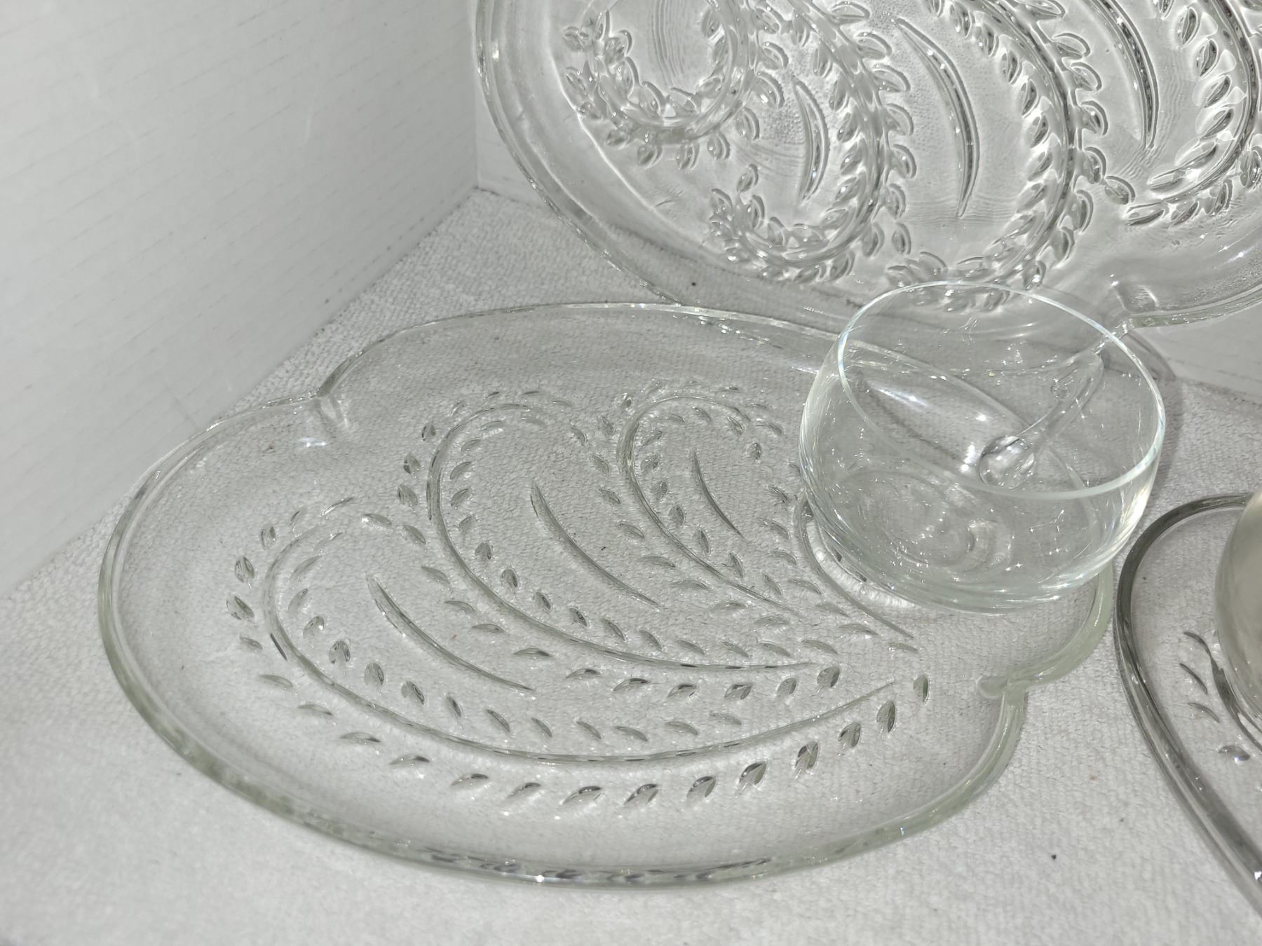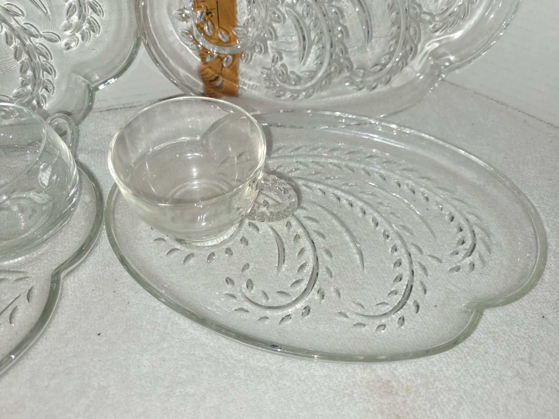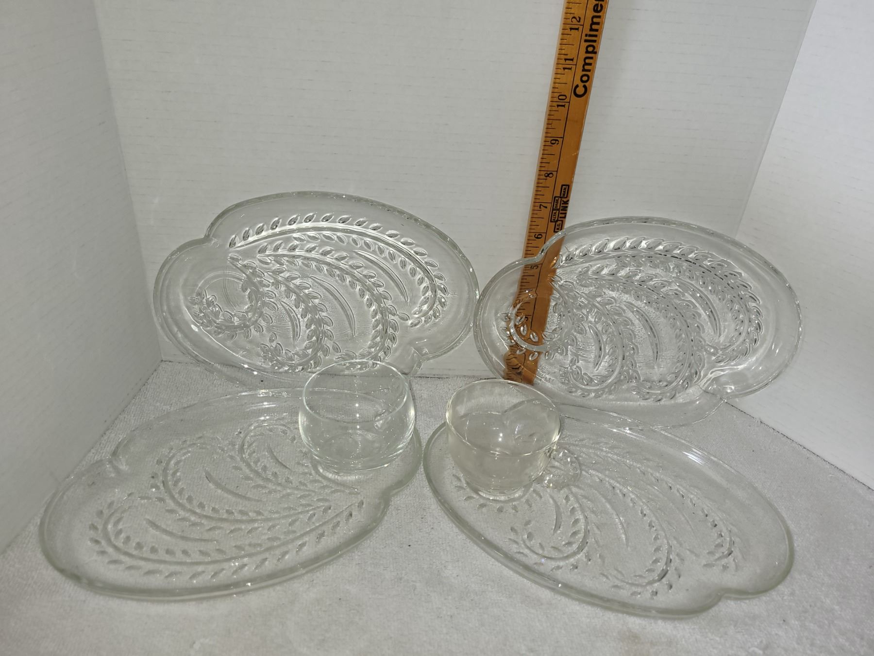 LOT OF 4 PICNIC SANDWICH PLATES & 2 GLASS CUPS. PLATES MEASURES 10" X 7"