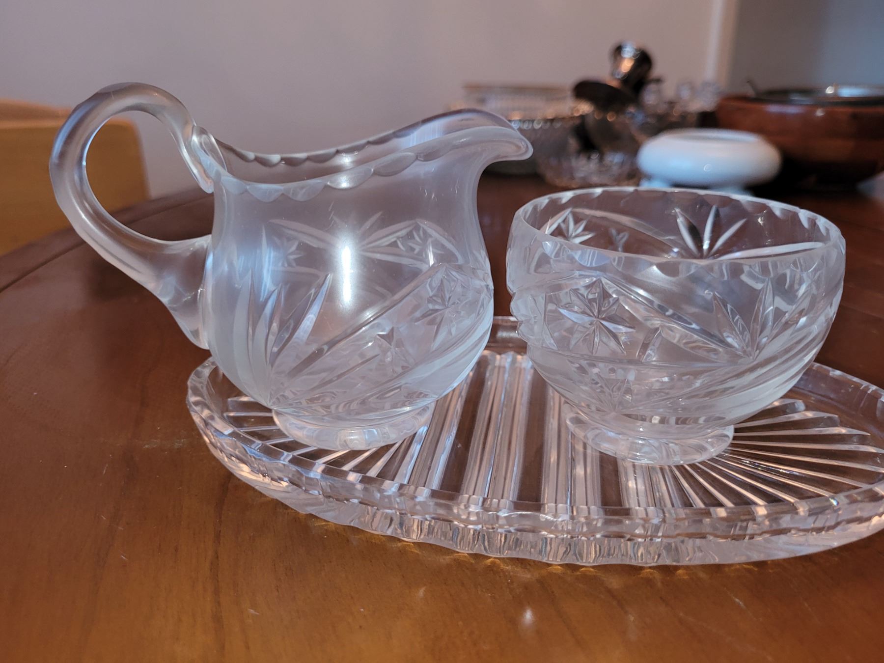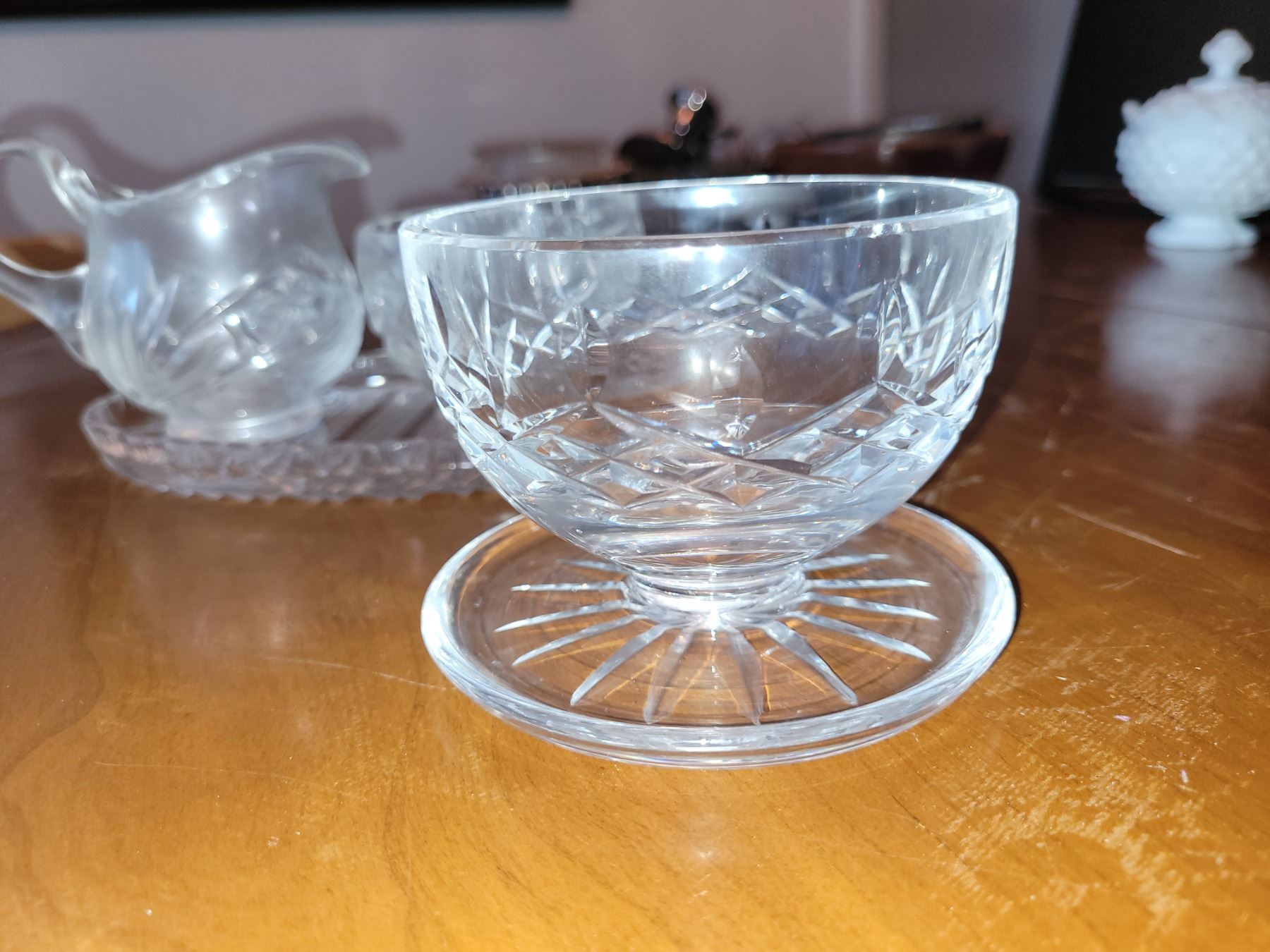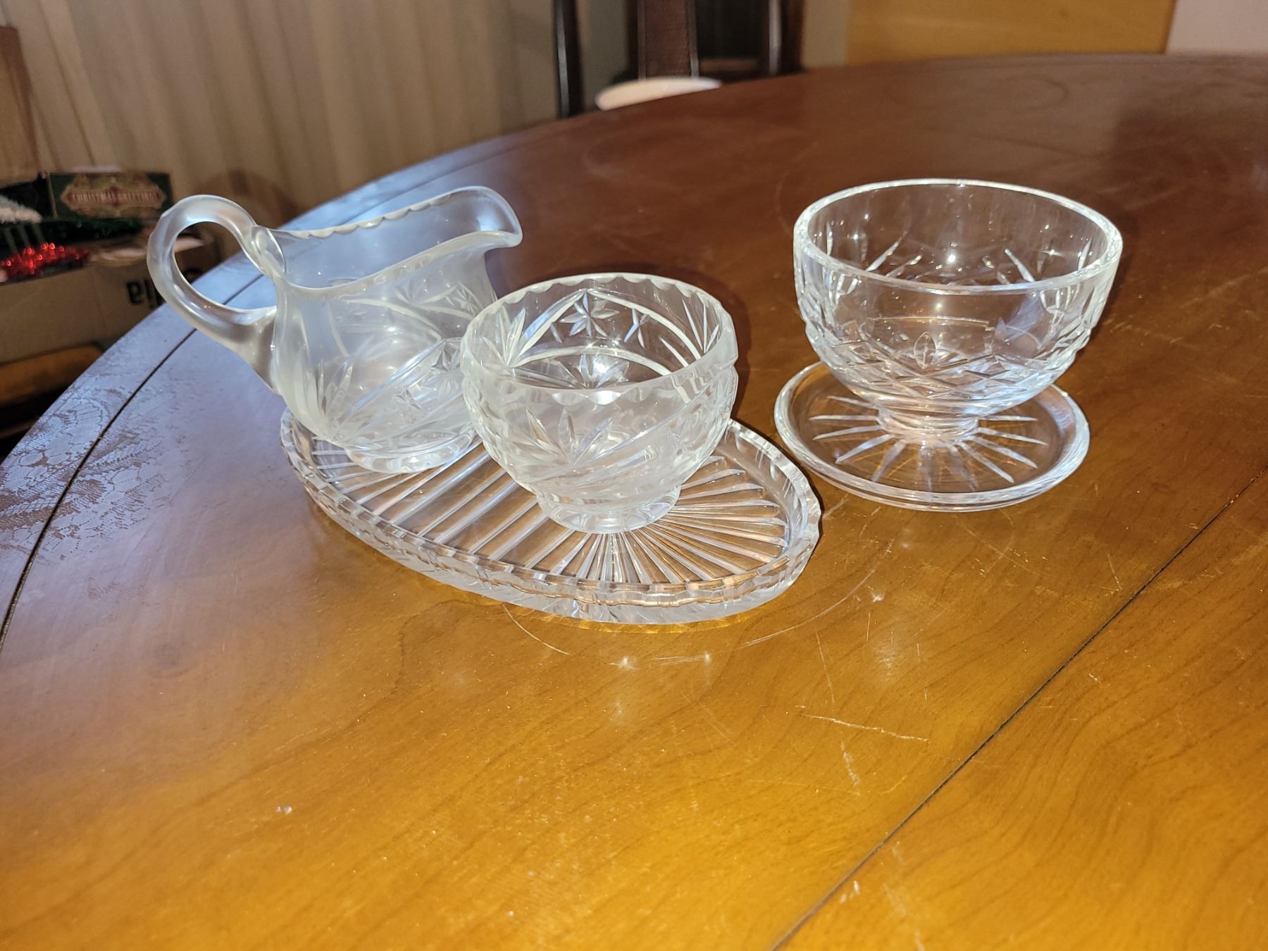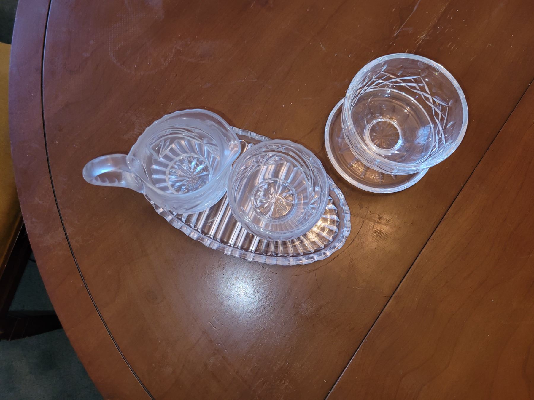 CREAMER, SUGAR BOWL, UNDERPLATE AND MINT DISH. ALL UNMARKED