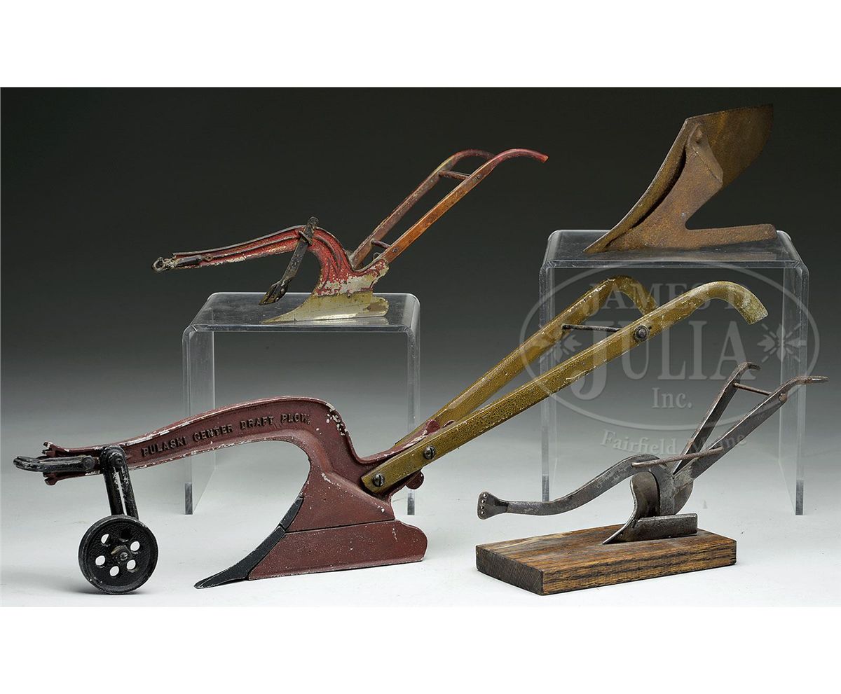 Lot includes a variety of two handled walk-behind plows including an A. E. Olmstead and Sons "Center Draft" aluminum example from Pulaski, NY. Painted in old red, mustard and black. Also includes brass and wood example, an all iron example mounted to a wooden base and a large steel standalone blade, all of which are unmarked. SIZE: Largest 23-1/4" l x 7-1/2" h. CONDITION: Lot is generally good with chips and oxidation to metal finishes. Large plow blade has a rough pocked finish. 1-13560